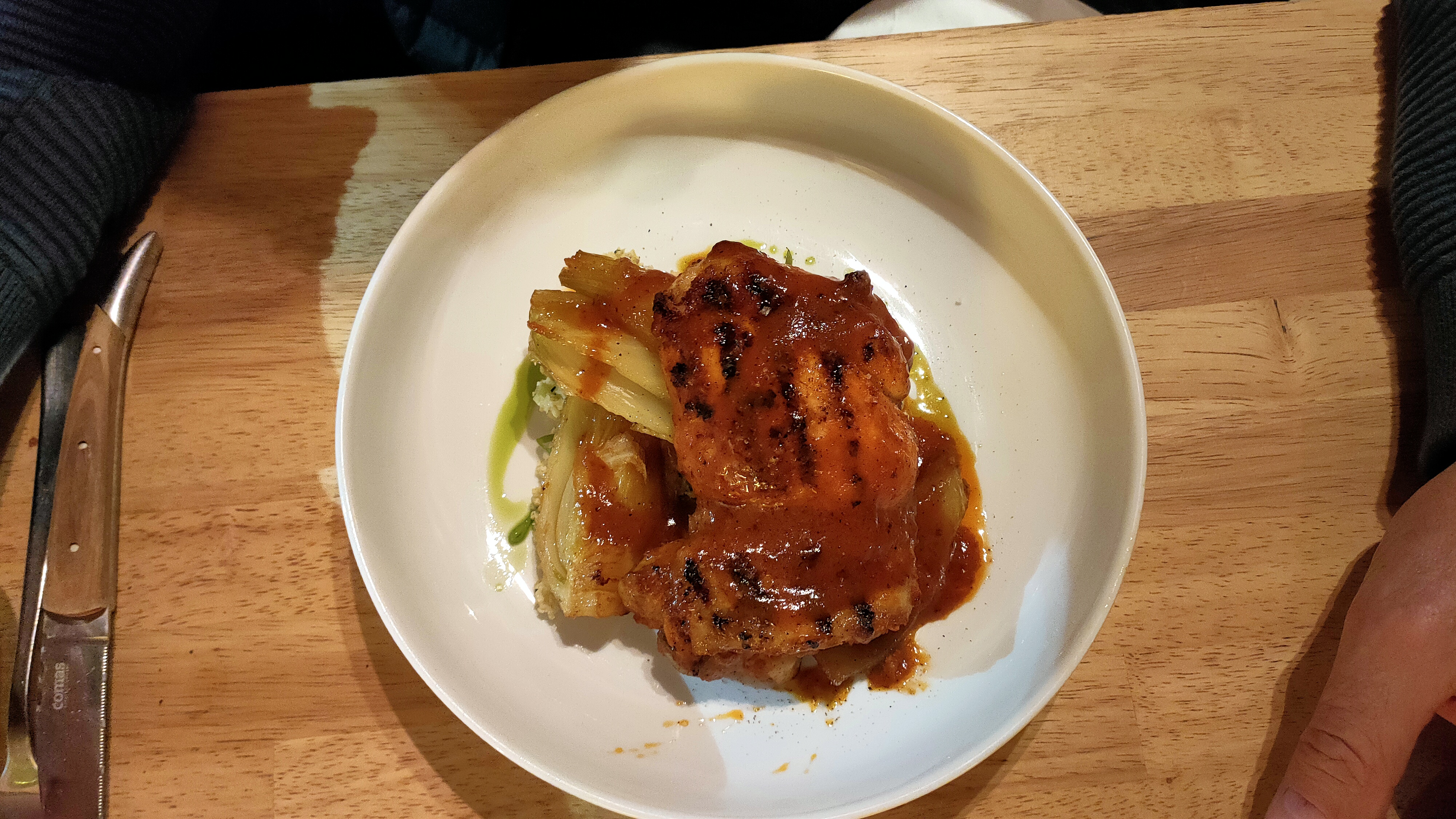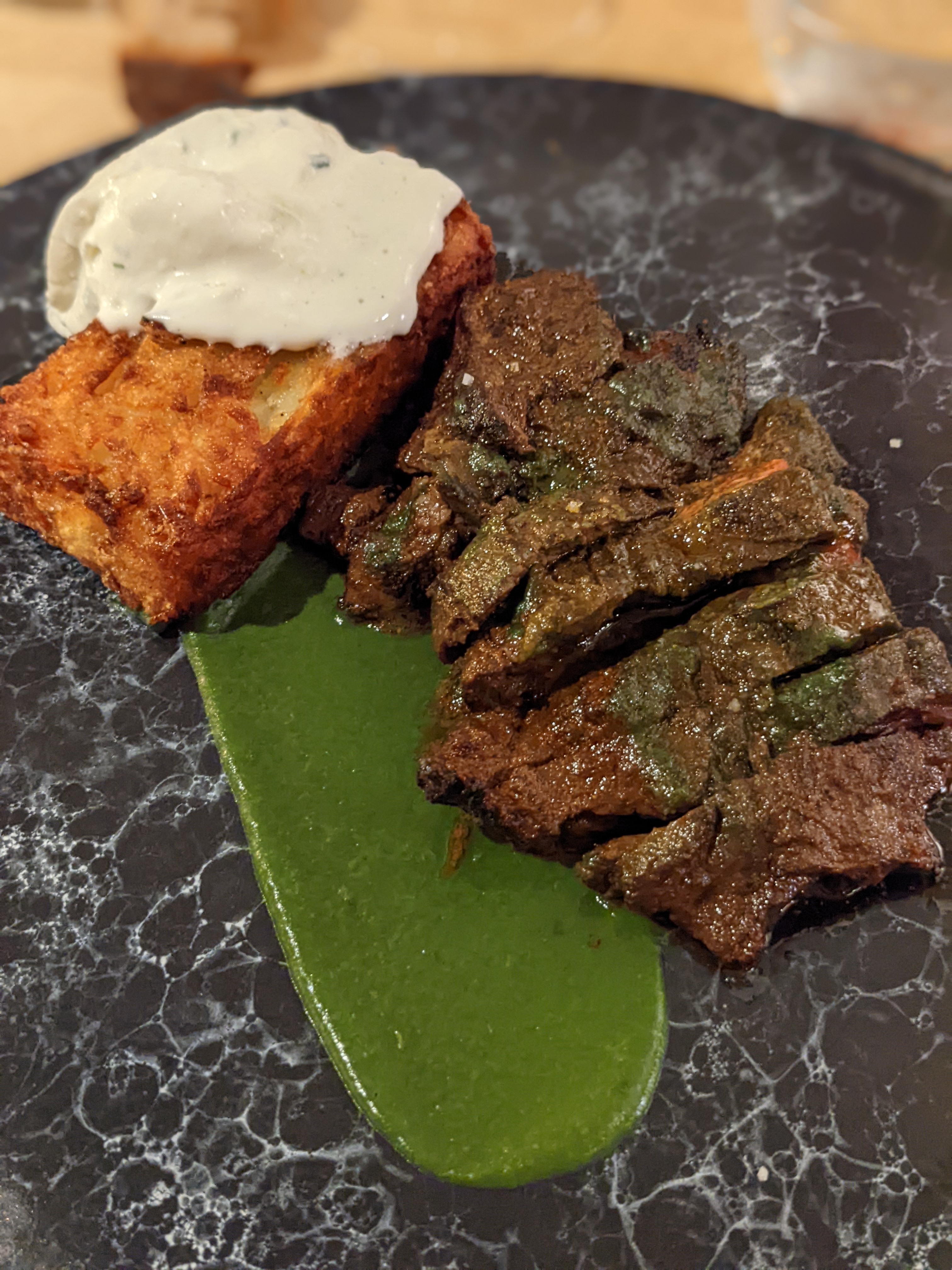 Absolument l'un des meilleurs repas, ambiance et service de nos vies. Nous vivons à New York, mais nous aurions aimé vivre ici pour revenir tous les soirs dans ce restaurant incroyable. Les combinaisons de saveurs de l'apéritif d'espadon, du steak de jupe et du plat de poisson étaient tout simplement incroyables, tout comme le dessert au brownie avec des morceaux de bacon.