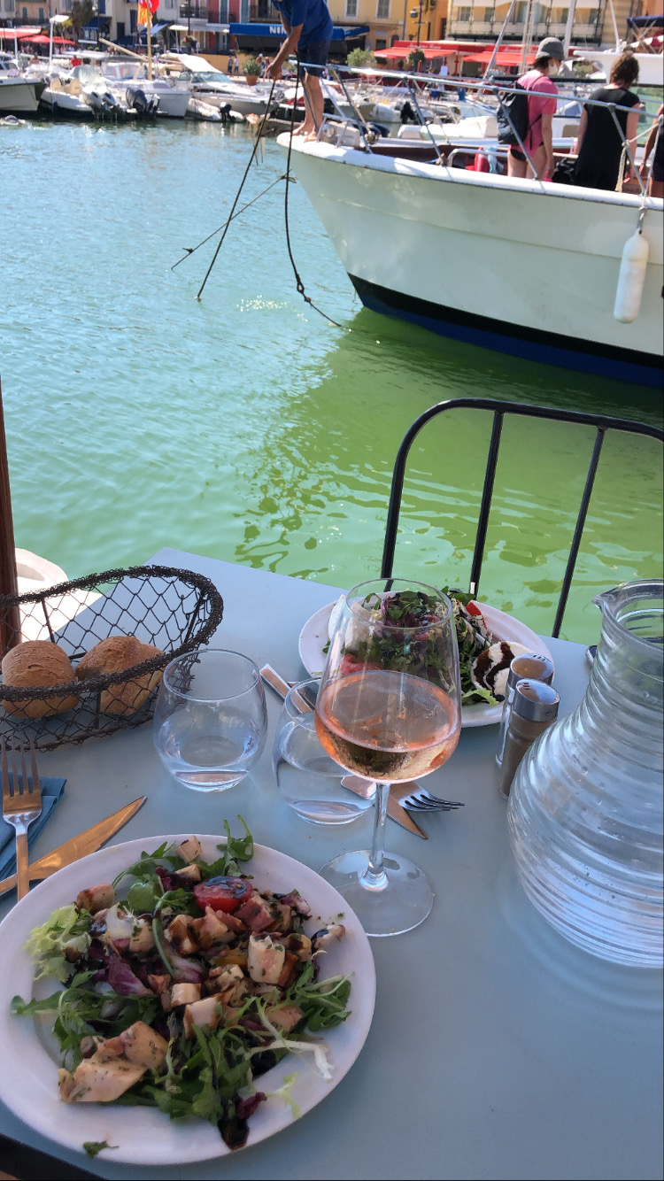 A fuir, sauf la vue, mais Cassis mérite mieux que ce restaurant de niveau médiocre, seul le rosé était bon. Une salade César à 16E50 pour trois morceaux de poulet noyés, dans une salade avec une sauce industrielle, deux rondelles de tomates sans saveur... Des croutons imper durs. Immangeable. Juste petite précision on a mangé vers 16h30 et la serveuse ose vous dire que des tables mieux placées au soleil sont réservées... Nous allons très souvent au port de Cassis, première et dernière fois dans ce restaurant... Pour info nous avons pris le dessert dans un autre lieu du port.