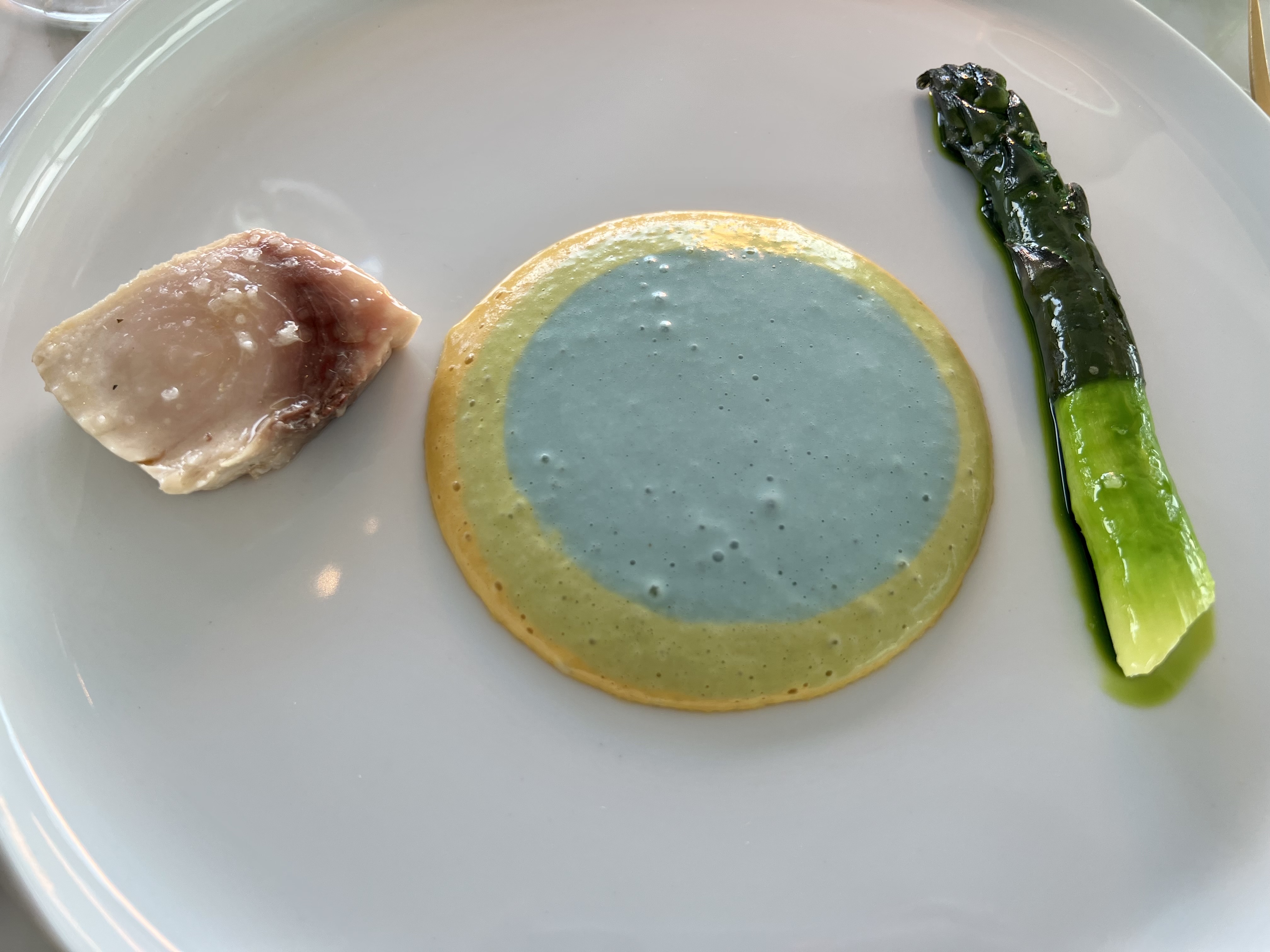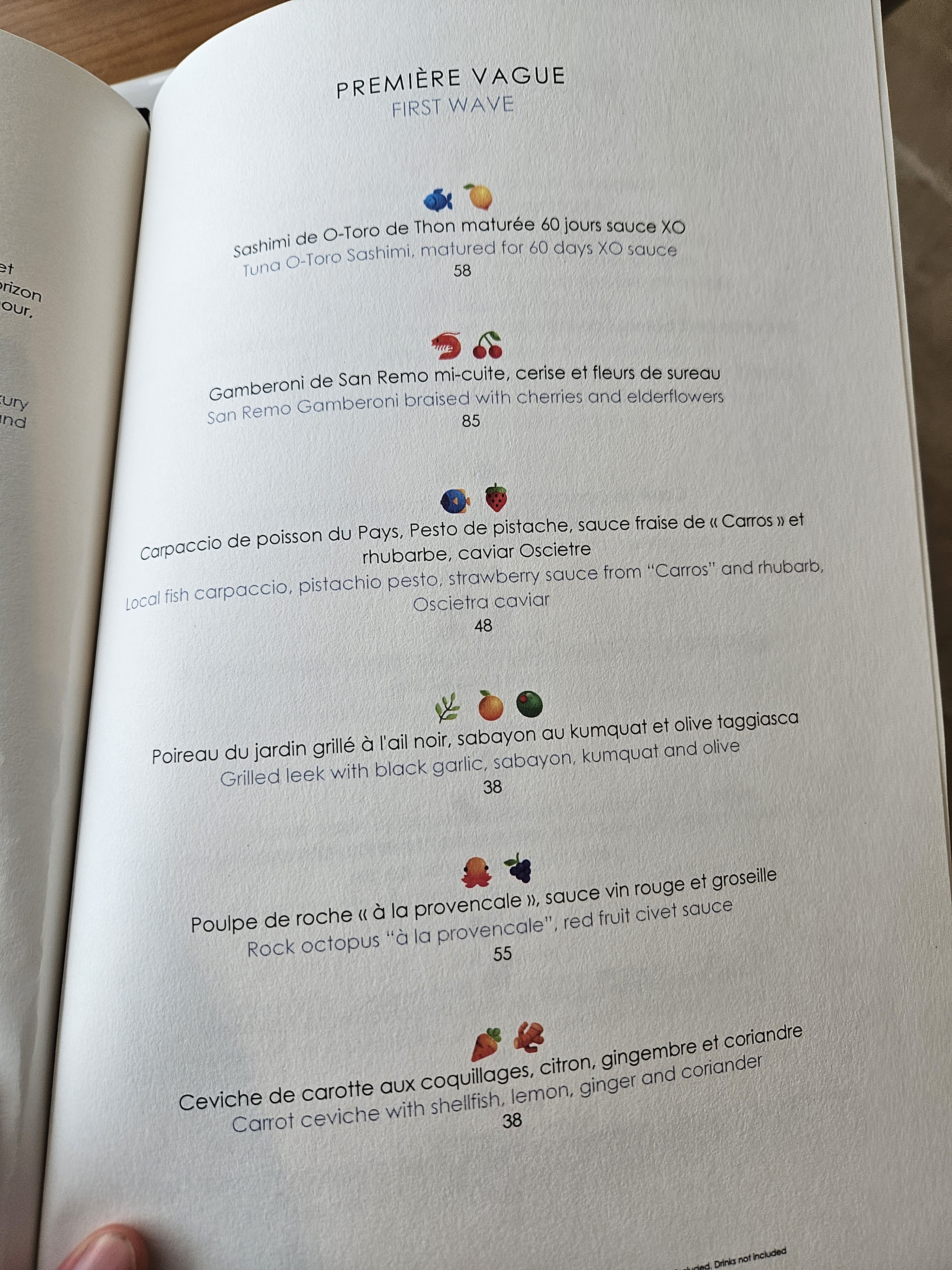 Le lieu est sublime et mériterait un chef à la hauteur, ou peut-être plus appliqué à ce job. Il est parfaitement anormal qu’un si bel endroit ne soit pas plein à craquer avec six mois de liste d’attente comme chez les autres chefs de qualité. Ce jour 6 juillet en pleine saison, il y avait seulement 6 tables occupées. Le lieu est réellement fabuleux en roof top 14ème étage ouvert sur la baie de Méditerranée et Monte Carlo. Le repas est insuffisant, pas terrible quoi… Portions modestes, on repart avec l’idée de se faire un after quelque part pour se rassasier. Plats compliqués bizarres. Mâturer le poisson, est-ce vraiment une bonne idée ? Les accords plats vins sont là encore bien artificiels. On pense que la formule a pour premier but de fourguer les péremptés de fond de cave. Le personnel est gentil, attentionné mais a-t-on vraiment besoin de deux sommeliers pour 6 tables, 15 personnes en tout ? Au parking les voituriers, pléthore également, furent incapables de manœuvrer ma voiture et ont saccagé le porte document. Pas bon tout ça.