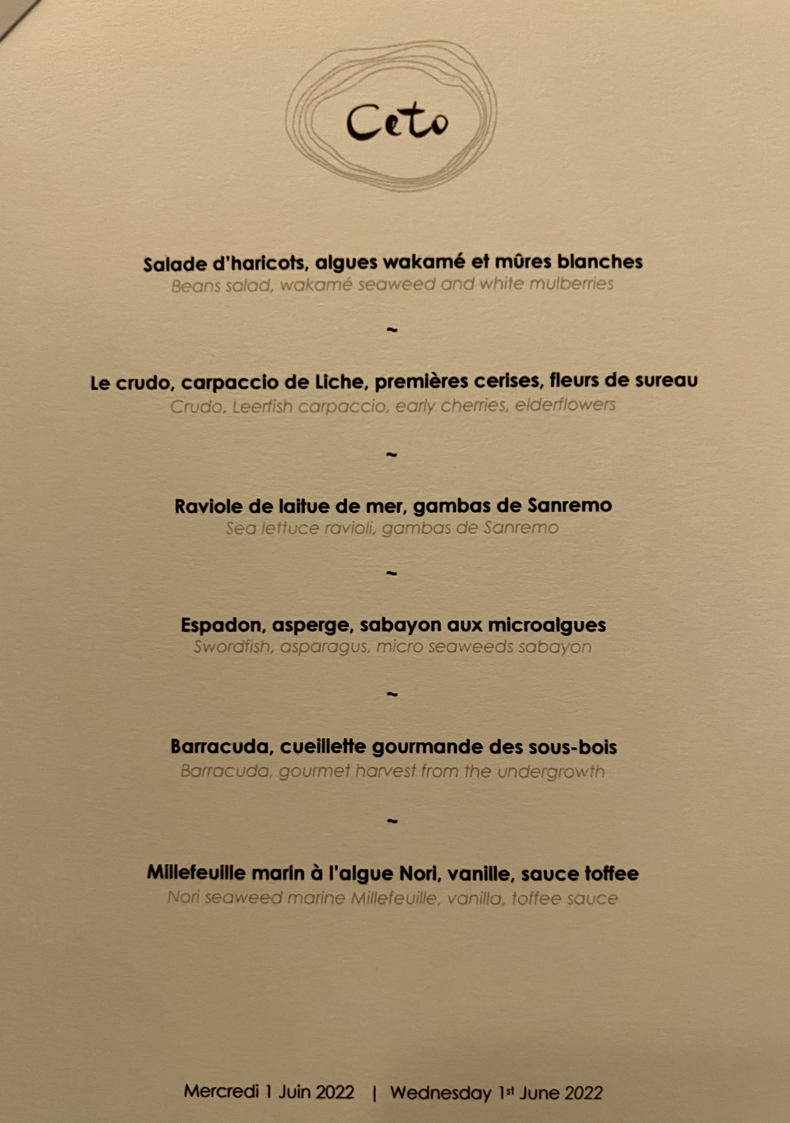 Bonjour a vous, C'est la troisième fois que je dîne au CETO, et tout était PARFAIT. Le Céto est immanquablement mon pied a terre culinaire dans le Sud de la FRANCE. Le chef est a mon sens, toujours aussi digne d'un MICHELANGELO dans le domaine de la cuisine. J'ai très apprécié les nouveautés du menu découverte de la mer L'endroit et le personnel en salle sont toujours époustouflant et très professionnel. Les desserts du chef son merveilleux et originaux dans le concept , goût et présentation et petit plus cette fois j'ai eu droit a une nouveauté.....succulente. L'accueil est toujours très chaleureux et on vous laisse plus que jamais cette sensation de toujours avoir réservé en VIP , avec un personnel qui excelle dans la discrétion , la courtoisie et les petites attentions, avec en prime le privilège de saluer le chef en toute simplicité . Une fois encore je recommande donc le CETO pour une découverte axé sur la mer et ses produits de proximité. mille merci a cette équipe, et a bientôt....probablement au mois de Mai 2024.