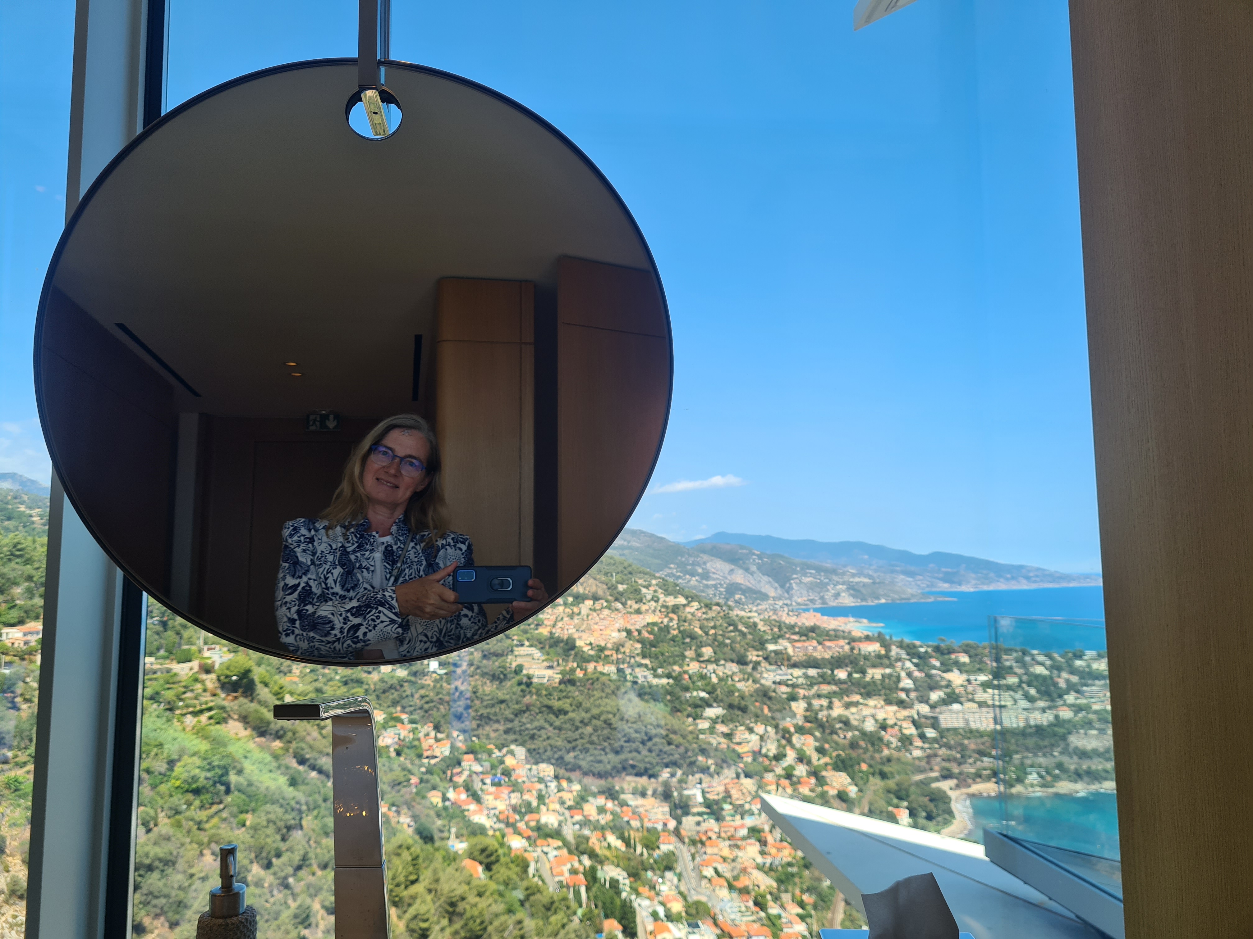 Tout commence par la vision de ce superbe hôtel en équilibre à flanc de montagne surplombant Cap Martin, Monaco. L'accueil est parfait. 14e étage et là, super accueil encore, un cadre épuré, une table en rive de terrasse offrant une vue à couper le souffle. Nous prenons le menu dégustation, excellent et savoureux avec ses vins et ses desserts...associé à cette vue, un moment particulier et magique. Le service est impeccable et discret. une équipe jeune et souriante ce qu'il faut. Tout est parfait. Pas de photos, on vous laisse découvrir.