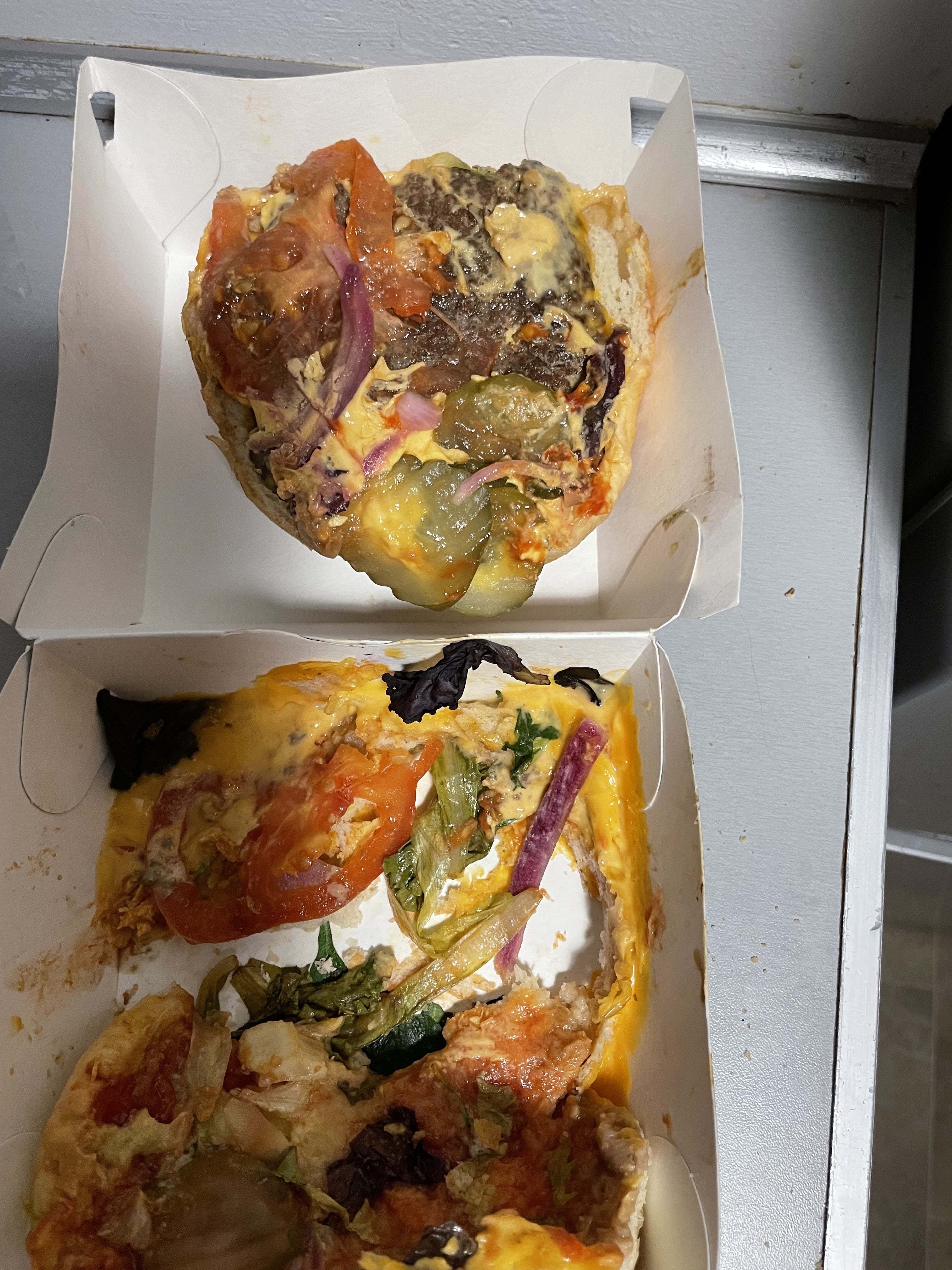 Viande pas fraîche(odeur), oublis d'ingrédients, araigné au sol , j'ai du demander plus de bacon sur les frites car il y avais 2 pauvres bouts , bacon sec .. frites potatoes blanche sur un côté mal cuites . pour 18euros très decus