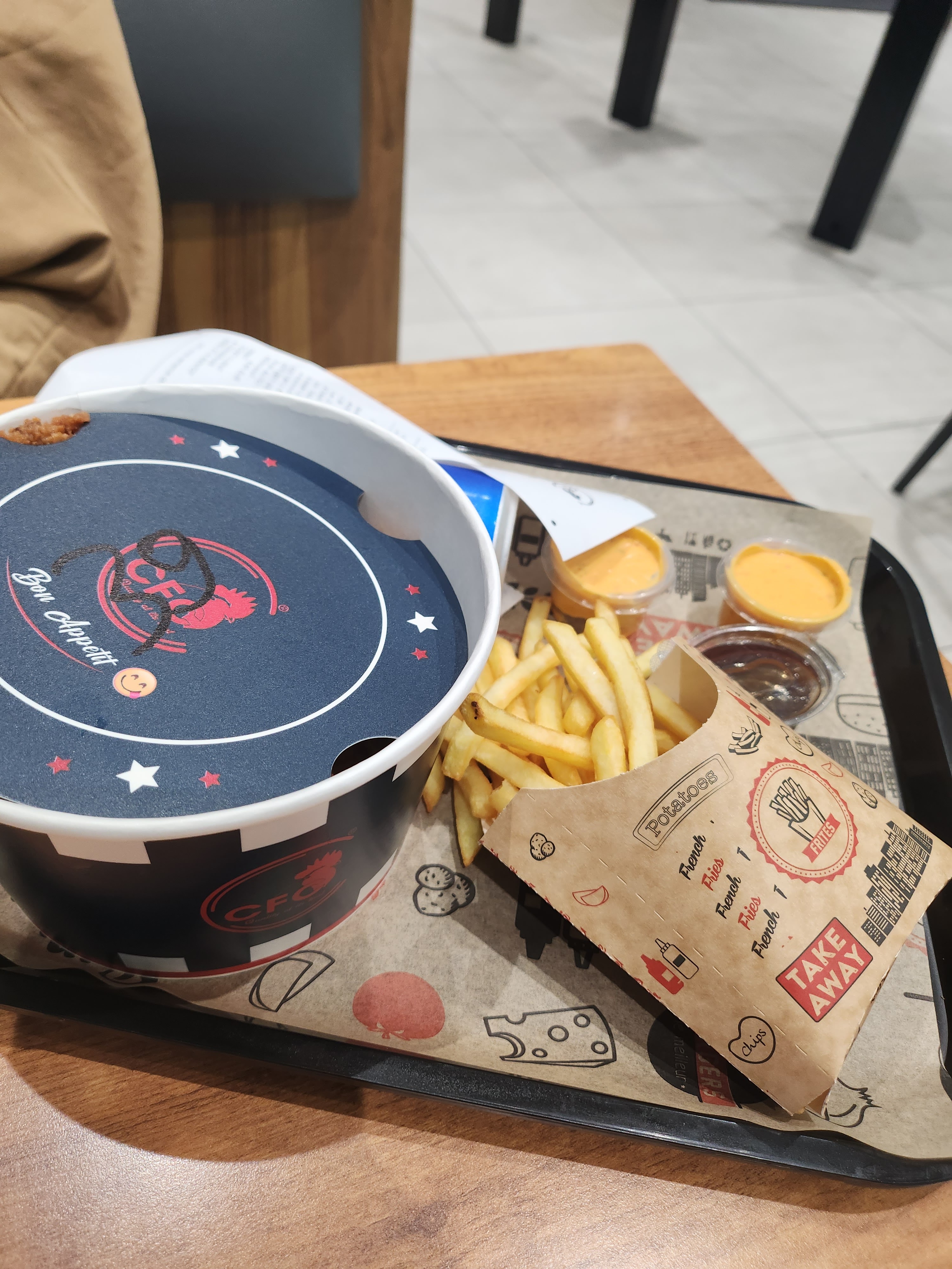 Excellente expérience, le poulet pané pourrais être plus ferme mais il reste de très bonnes qualités. L'ambiance néanmoins reste correct mais la musique des robots chats peut être désagréable a bout d'un moment. Mais le personnel est très chaleureux et agréable je recommande CFC 👍