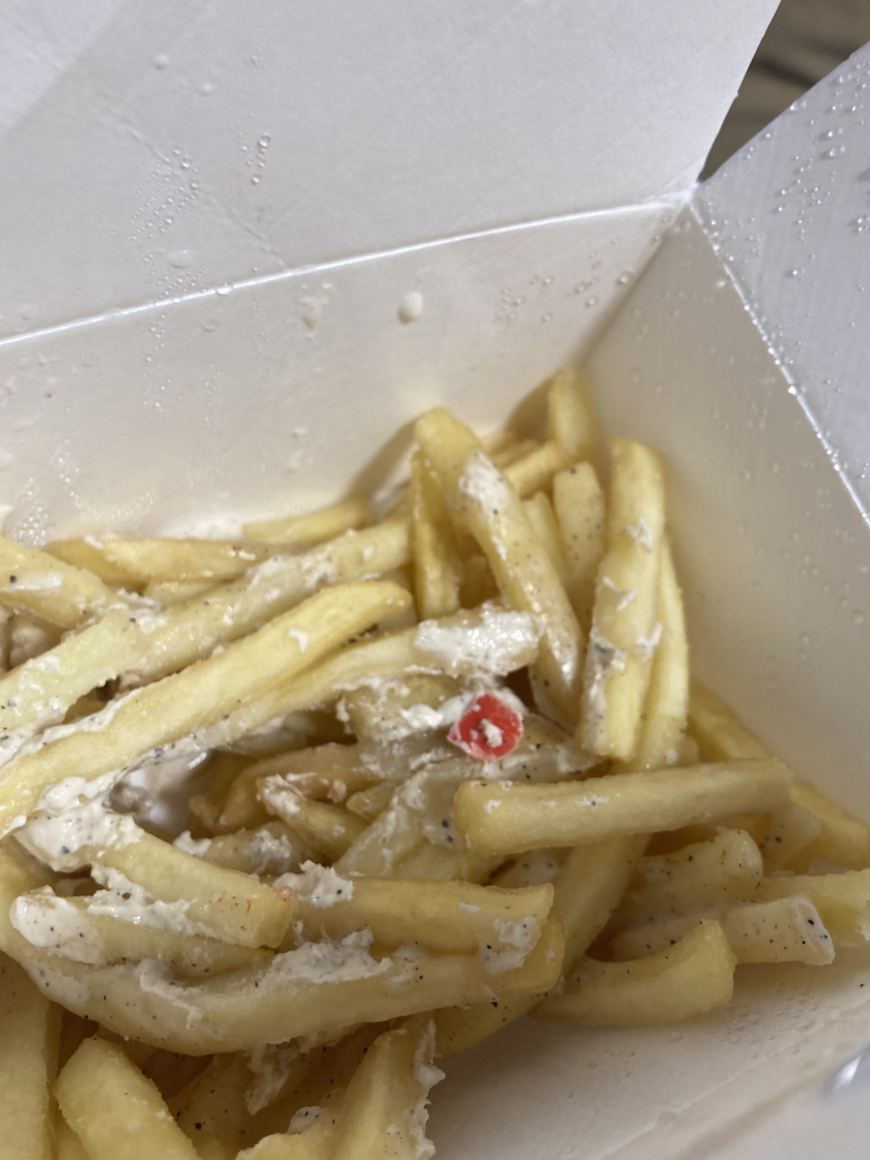 J’ai commandé sur Deliveroo mon repas vers 20h15 pour recevoir la commande a 22h et complètement froide Impossible d’appeler le fast food en plus de ça Totalement inacceptable En plus de cela j’ai trouvé dans mes frites un bout de plastique rouge (ci dessous) Honteux je ne commanderai plus chez vous 😡