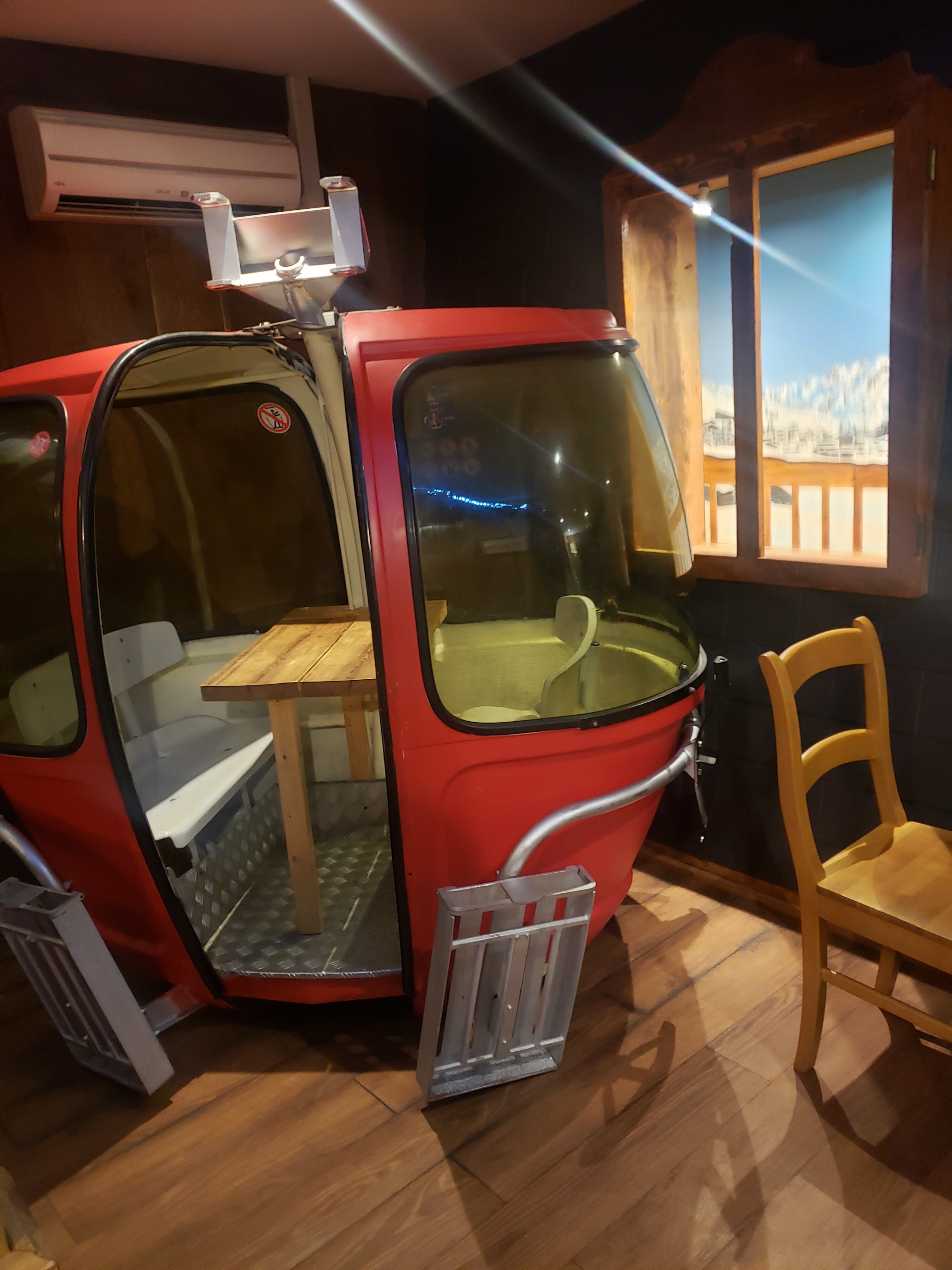 Un accueil chaleureux et sous le signe de l'humour. On pénètre dans un restaurant de montagne et il est même possible de manger dans une cabine de téléphérique (rarement disponible car très prisée). Vrai coup de cœur pour l'entrée : œuf cocotte au reblochon ! En plat une fondue savoyarde savoureuse et copieuse. J'étais bien tenté par une glace mais je n'avais plus de place !