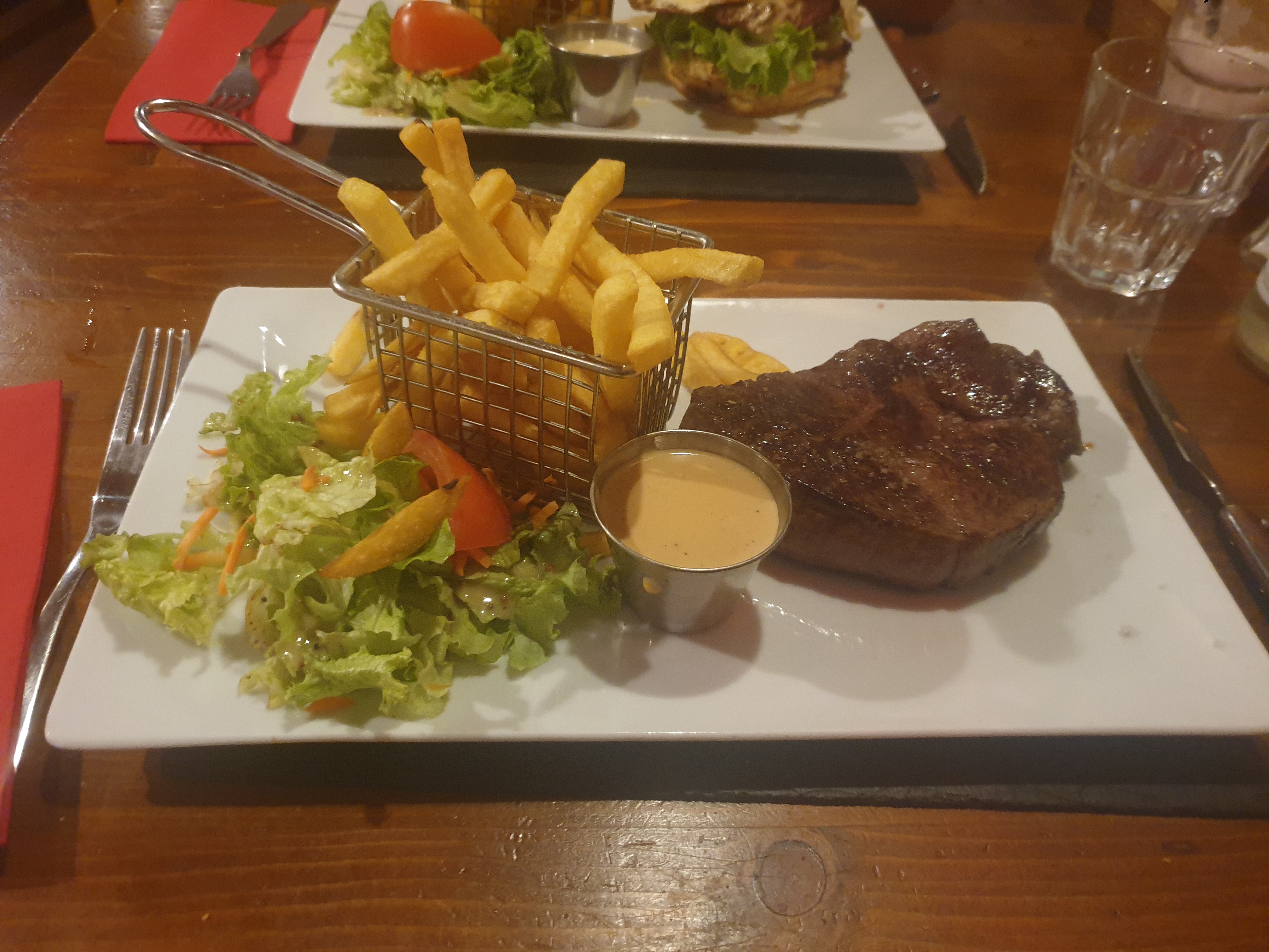 Les plats sont assez chers mais la quantité est là En revanche pour la qualité ça dépend vraiment des plats Dernier plat testé : la potence flambée au whisky, servie avec un gratin savoyard, délicieux bien qu'il manquait de sel, et trois sauces très bonnes : poivre, cèpes et bolets, et reblochon. Ça mériterait une petite salade en plus, pas pour la quantité mais pour ajouter un peu de fraîcheur. En dessert, la tarte chocolat au lait et caramel beurre salé était bonne, celle aux pommes moins car un peu sèche. Globalement satisfaisant. Vaut le détour pour l'ambiance et le décor également.
