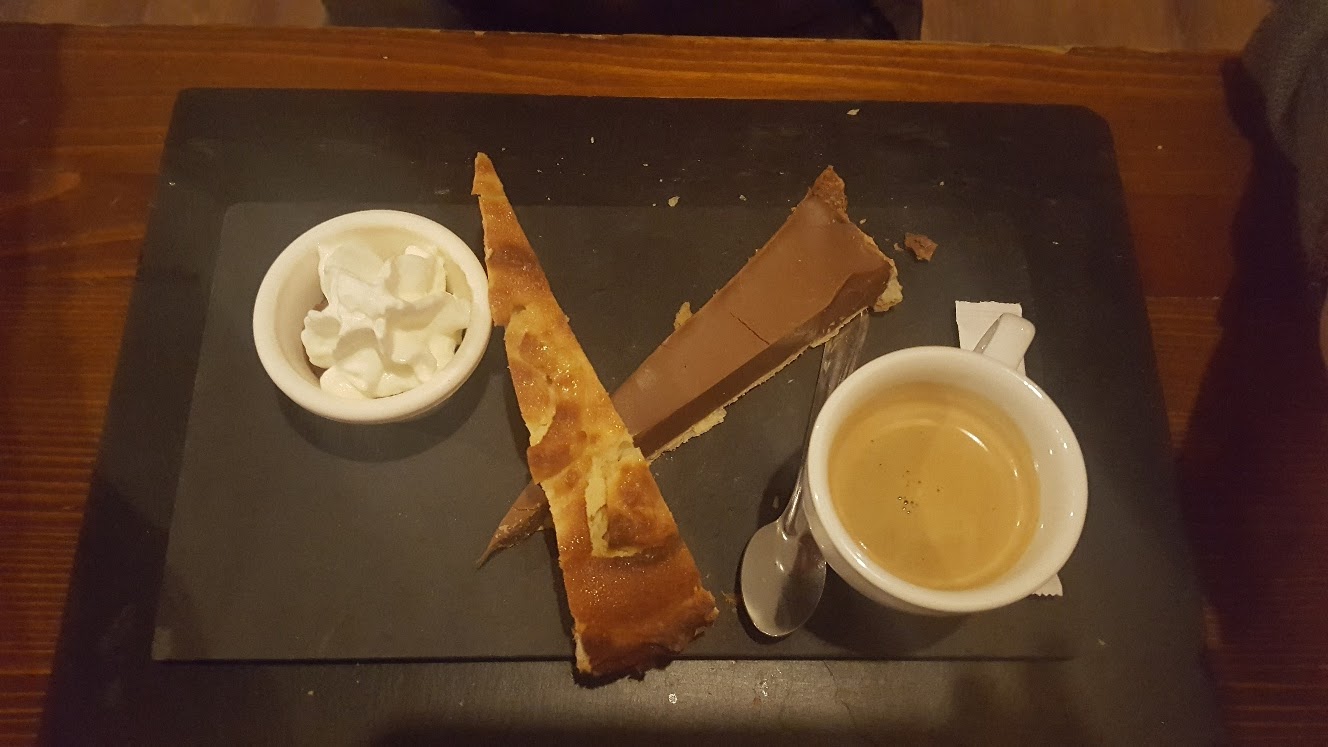 Nous avons passés un bon moment entre amis mais ponctué de plusieurs erreurs de service (mauvais plat, présence ou non de café dans le menu...) et nous avons donc énormément appréciés le geste commercial qui me fait rajouter une étoile à la note et dire qu'on pourra revenir. Mon welsh était bon dans un premier temps mais le taux de gras l'ont vite fait devenir écœurant. Ma glace pour le dessert était cependant très bonne. Il faut dire que le cadre et la décoration montagnards sont très agréables et nous ont fait sentir comme dans une petite bulle.