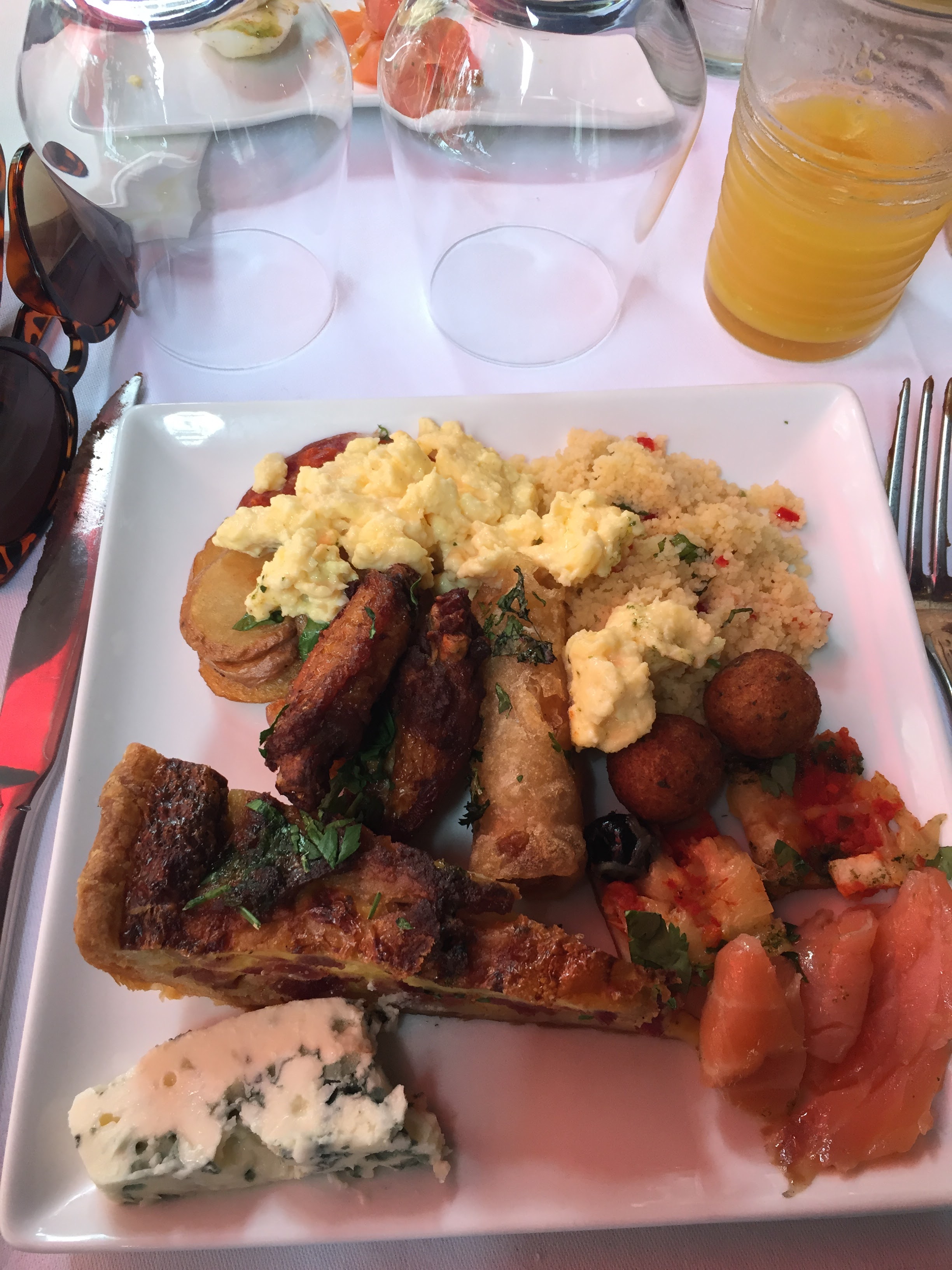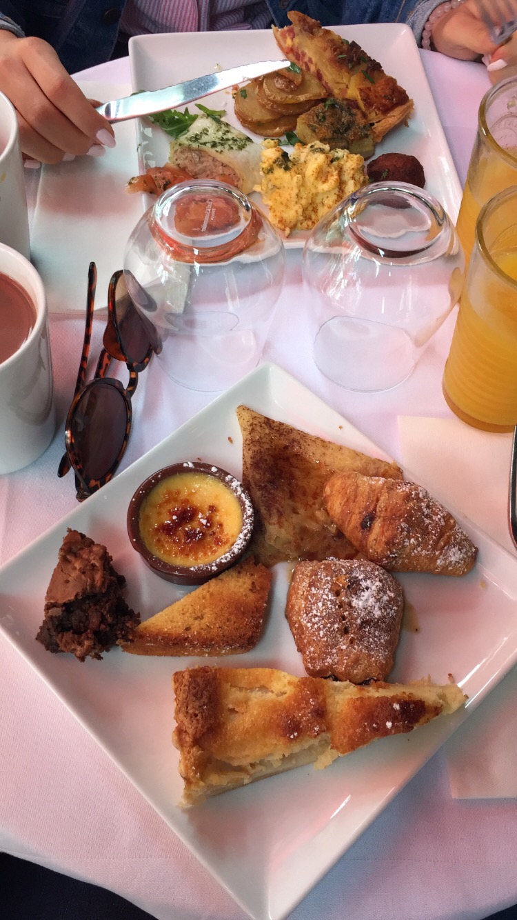 Un super brunch! Salé sucré a volonté !avec poisson, œuf, tomate mozza,poulet,viande,saucisse, fromage ,charcuterie, plats chauds !! Pommes de terre et légumes et les desserts waouh ! Pancakes , des fruits tartes,macarons,beignets vérines++, gâteaux,cannelés, viennoiserie, crêpes, et++ . Un très bon rapport qualité/prix . Allez-y et très bon l'accueil