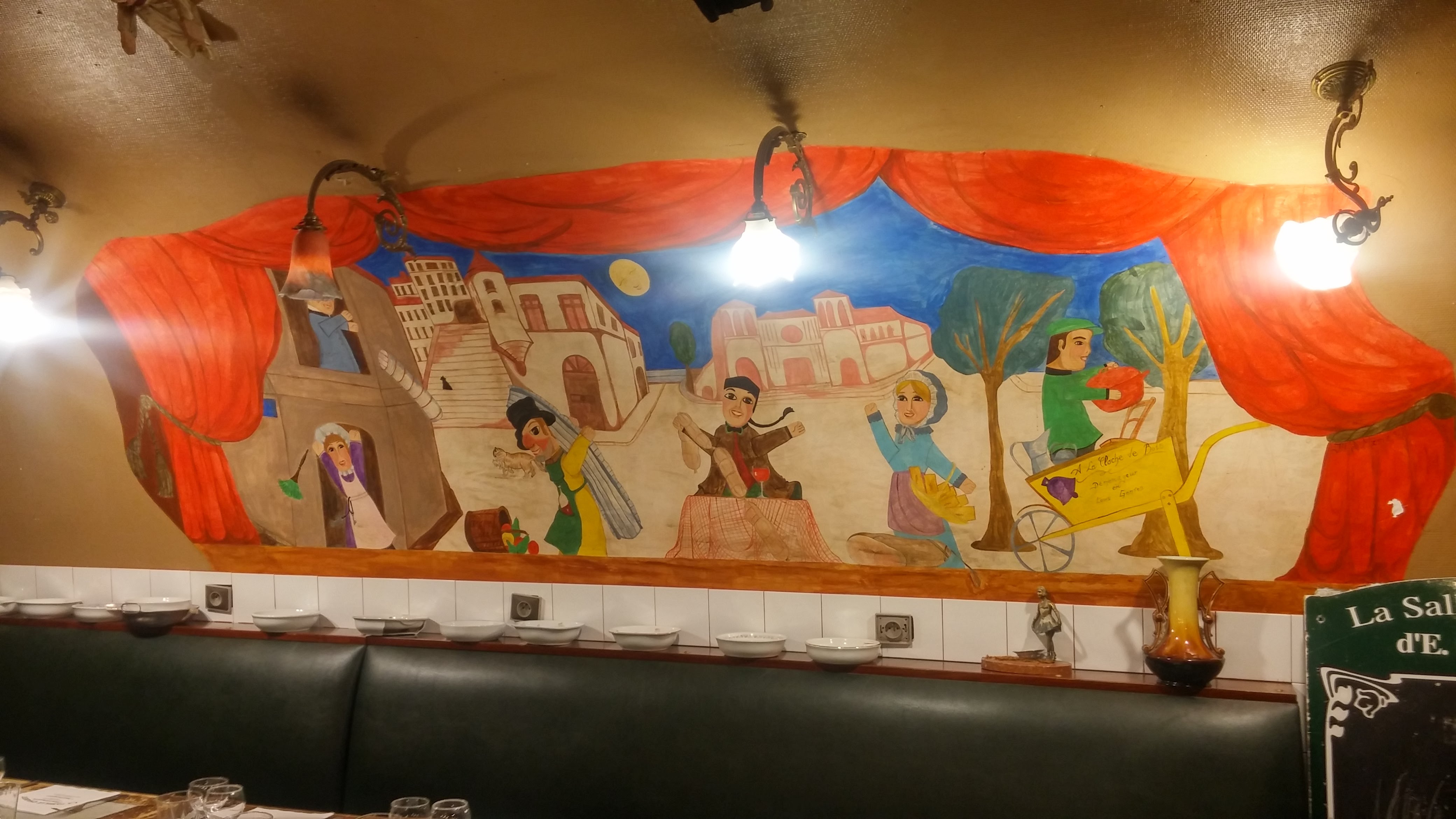 Deco tres sympa, avec Guignol omnipresent sur les mures. Menu de groupe : salade lyonnaise aux lardons et oeuf poche, quenelle a la sauce ecrevisse et ile flottante. Le gout des plats est bon, par contre, pour 28euros, la quantite etait insuffisante, aussi bien pour les quenelles (decoupees en rondelles, 4 ou 5 rondelles par personne) que pour le riz. Service rapide