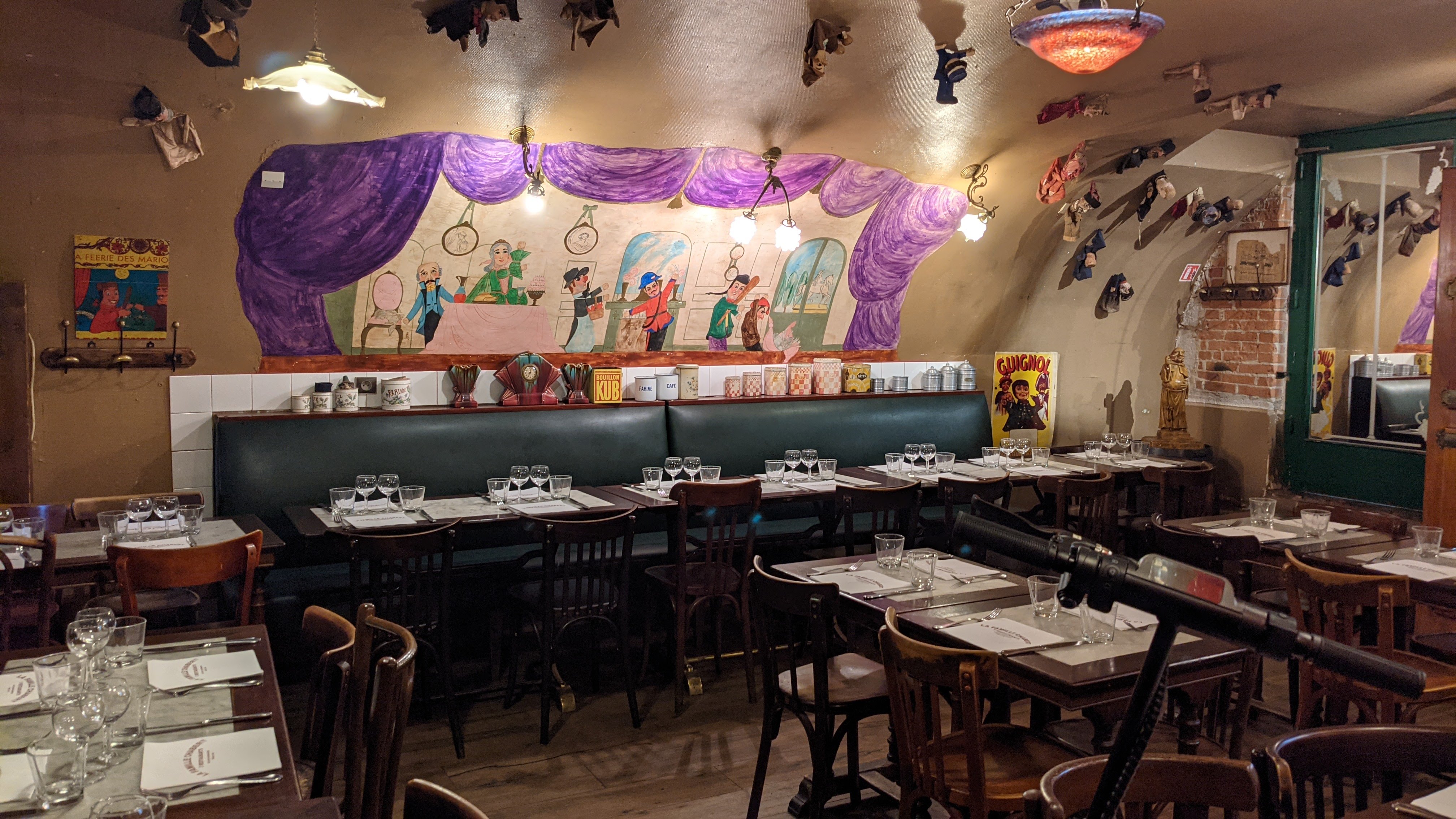 Le décoration de la restaurant est marrant et chaleureux façon bouchon/guignol. Très serviable et cuisine très bon. Le jambon est vraiment délicieux et le dessert Guignol est un régale.
