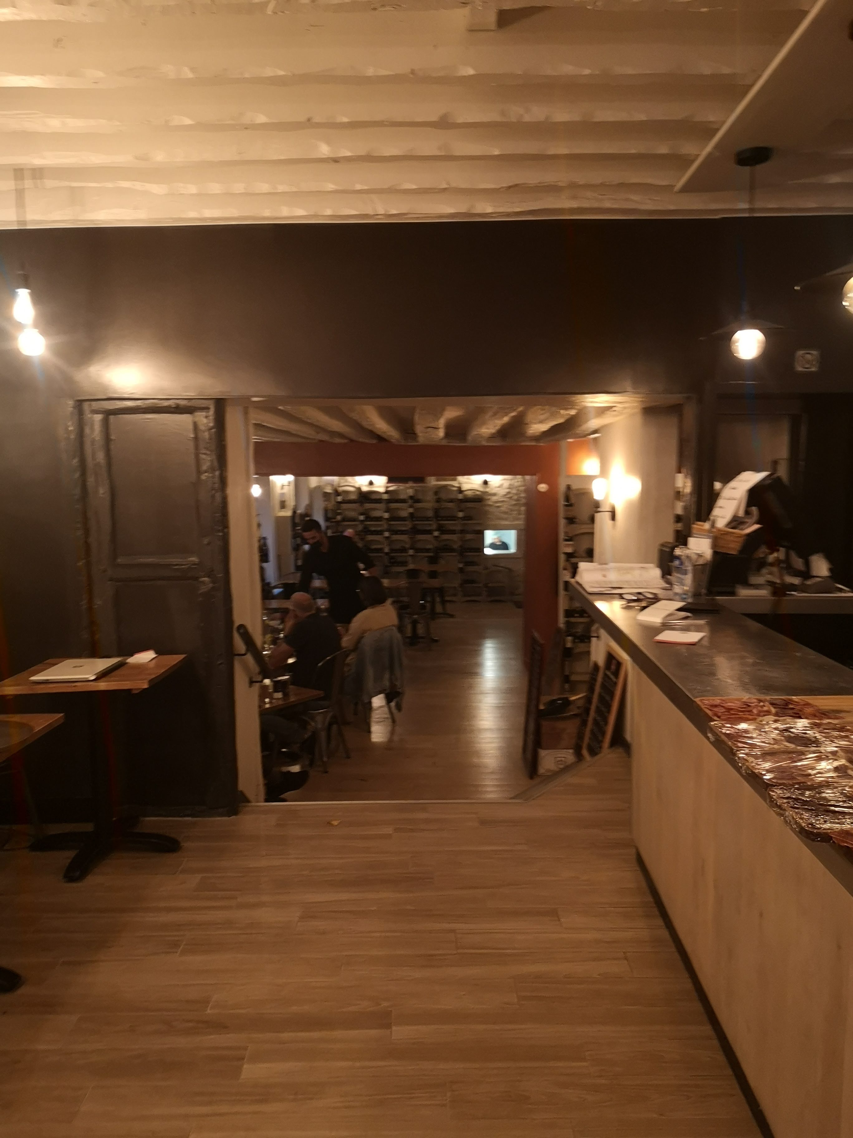 Superbe adresse. QUALITÉ des produits, des vins, ambiance bistrot dans une cave de vins! Service à l avenant et présentation des produits par le patron. La terrine maison est à tomber… les vins proposés ( bcp bcp de références puisque caves et plusieurs budgets ). Réunion d équipe et tout le monde a aime… patron, préparez vous, on va revenir!