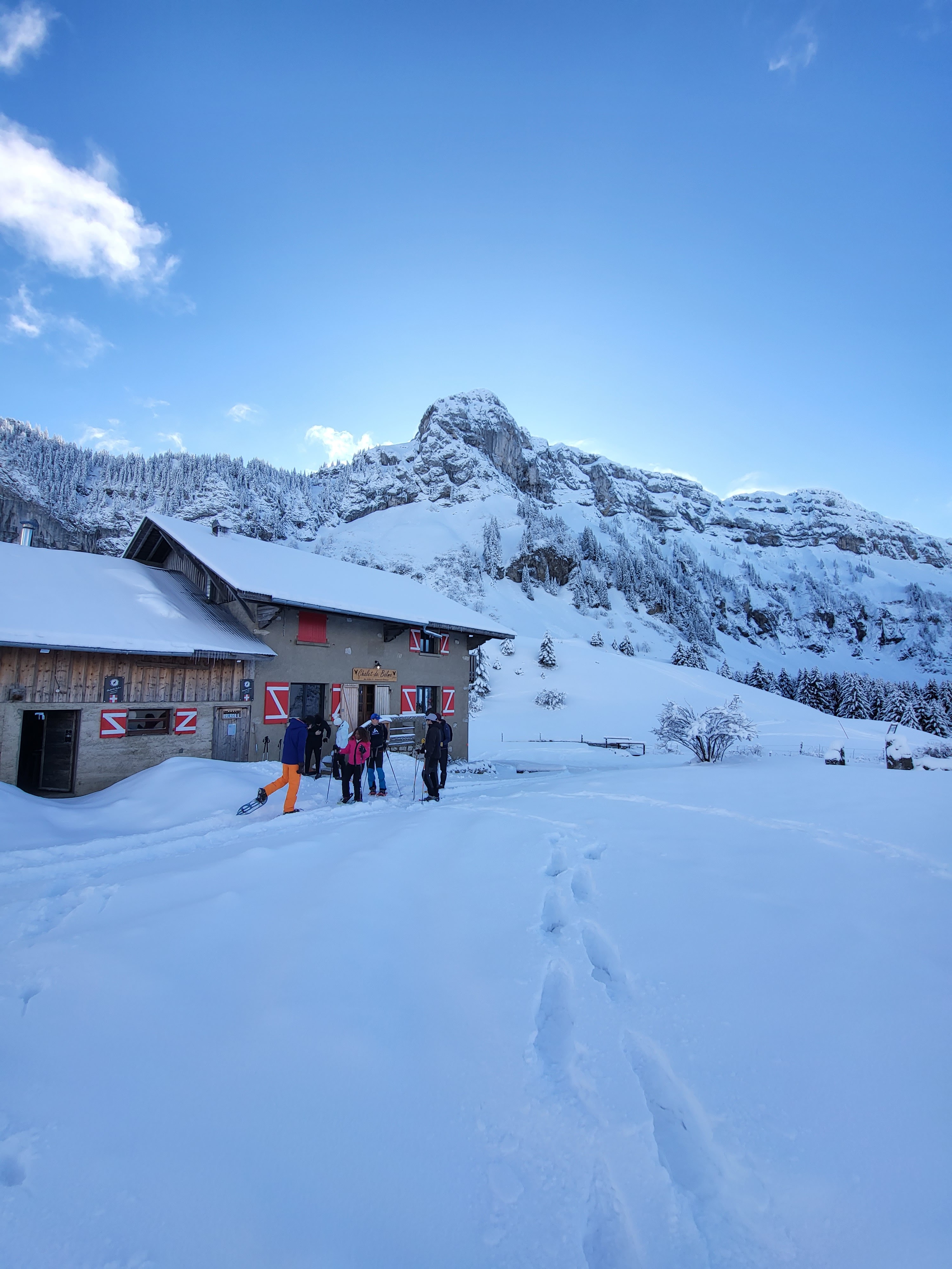 La grimpette c'est pas de la tarte, faut pas se mentir.......on finit dans 60 cm de neige, bref jusqu'au genoux, les derniers 250 mètres sont les pires.....mais ça vaut vraiment le coup, l'accueil est vraiment sympathique, la fondue savoyarde servie sur le brasero en extérieur est excellente ,ambiance conviviale et un cadre magnifique ...........super journée