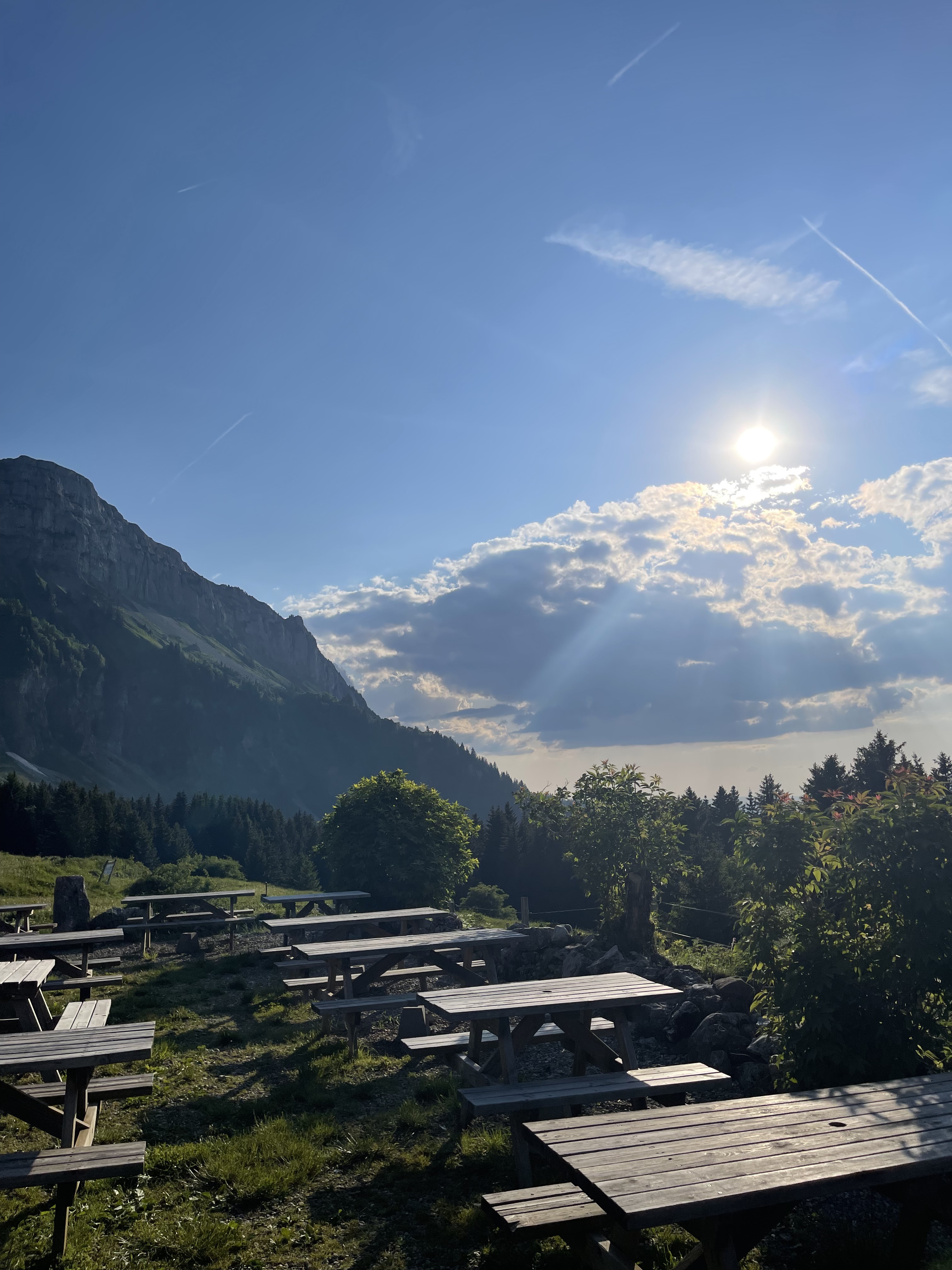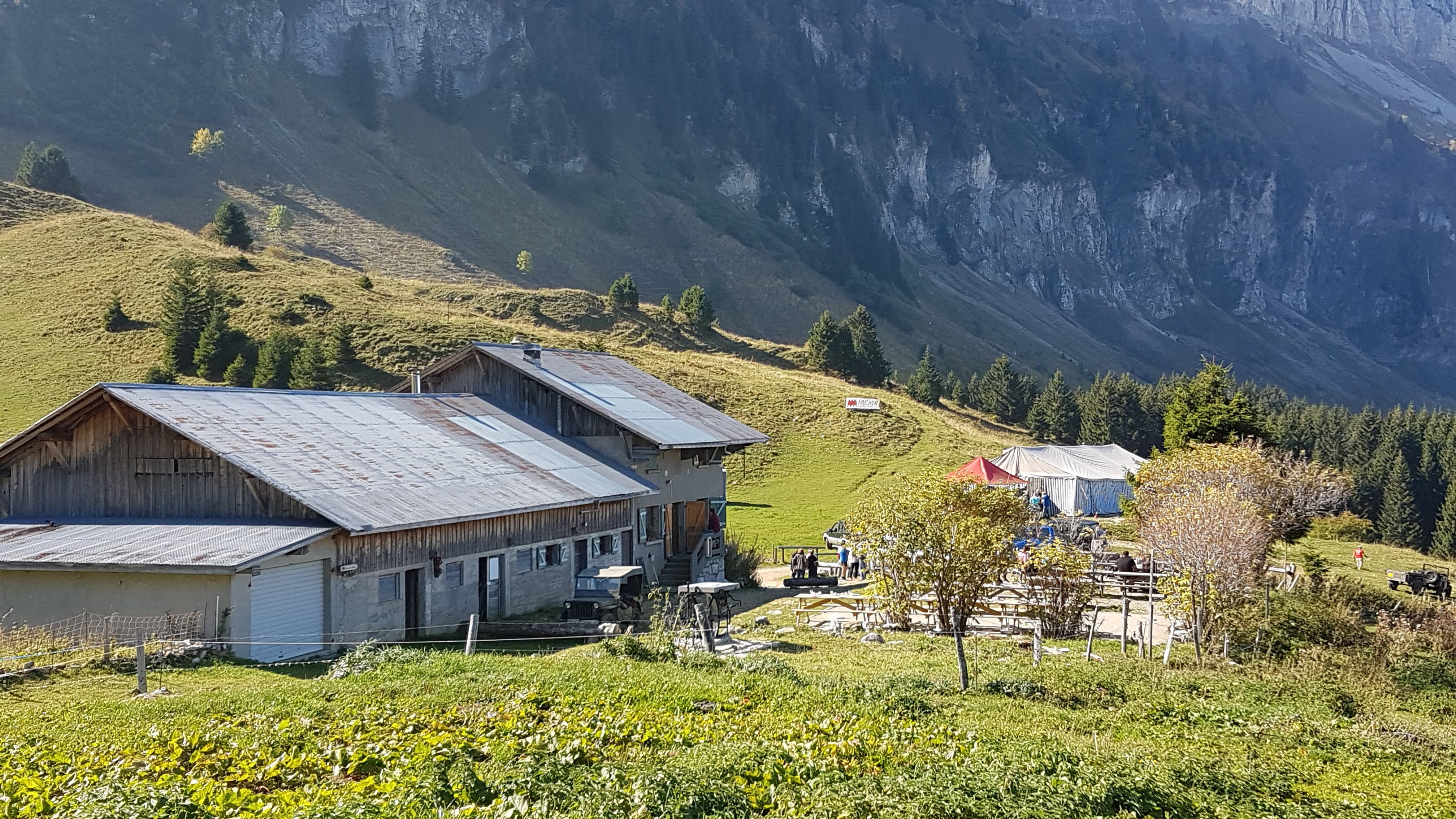 Environ 45 minutes de marche avec un début assez raide mais sans difficulté et tout au long du parcours le paysage est superbe avec vue sur montagnes, forêts, lac Léman au loin. Et arrivé au chalet à flanc de montagne la vue est magnifique, une lumière superbe sur la verdure avoisinante et les couchés de soleil splendides. Une jolie et large terrasse devant le chalet avec de grandes tables de bois, en cuisine, Il n'y a qu'un seul plat, mais super bon ( ce soir là, salade du jardin, plat de charcuterie et beignets de vermicelle aux herbes, assiette de fromage) et bon vin ! et bien sur on peu planter sa tente aux alentours, y a pas d'ours qui trainent !