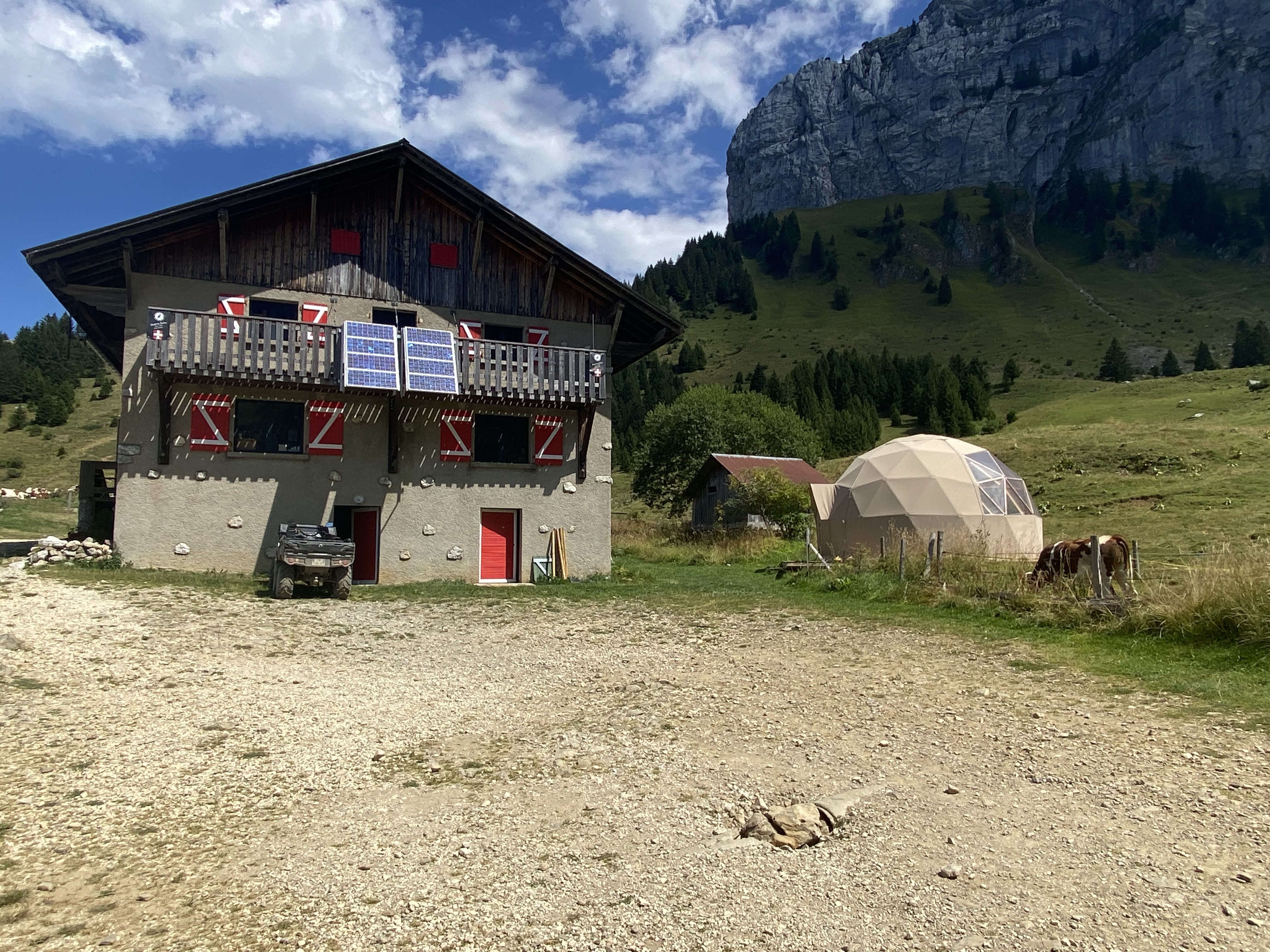 Super chalet de moyenne montagne avec la possibilité de dormir en tente géode sous un ciel étoilé avec un vue sur la roche Parnal. La cuisine était délicieuse (très bon choix de vin, bières et spécialités locales) et l'accueil chaleureux. Le gardien, Fred, nous a donné de bons conseils pour aller crapahuter autour du chalet (col du câble et arête SW des Tampes). Il manque plus que le wifi dans les tentes et on est proche du luxe.