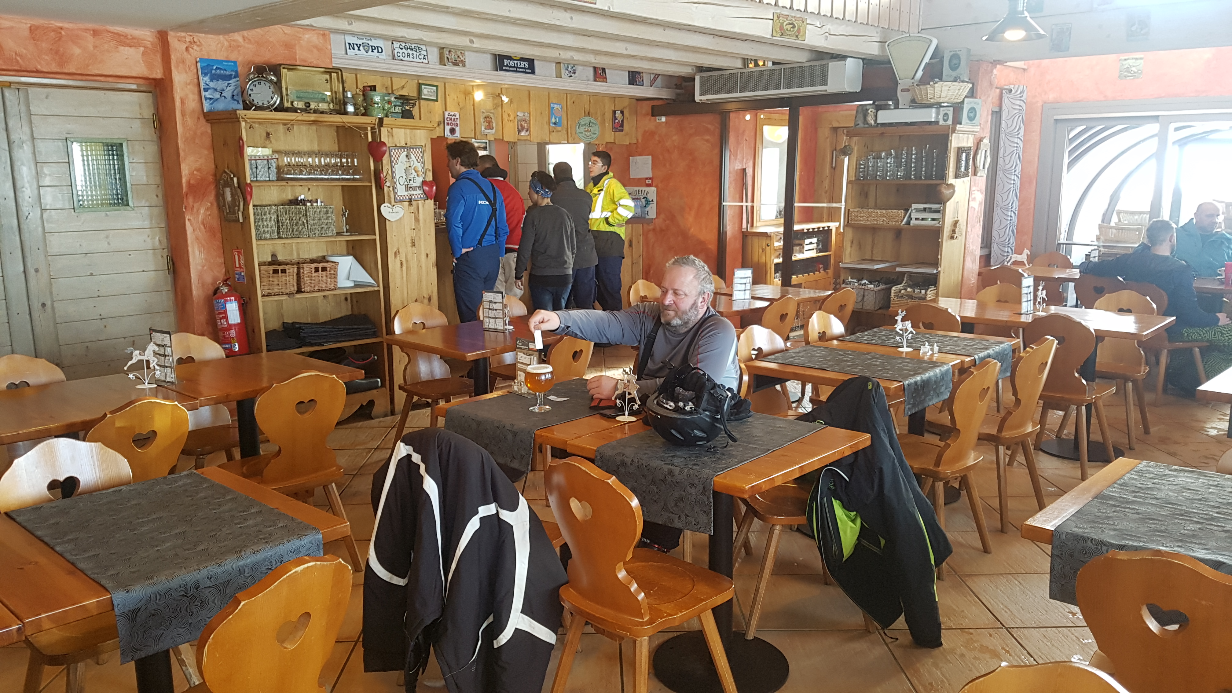 Super restaurant. Belle vue sur les environs. Ils ont plusieurs bières pression. Il est possible de visiter le restaurant sans skis ni snowboard. Possibilité de s'asseoir à une table ou de se détendre sur un transat. Les prix sont vraiment élevés, comptez un déjeuner moyen à 20 euros. Personnel sympathique!