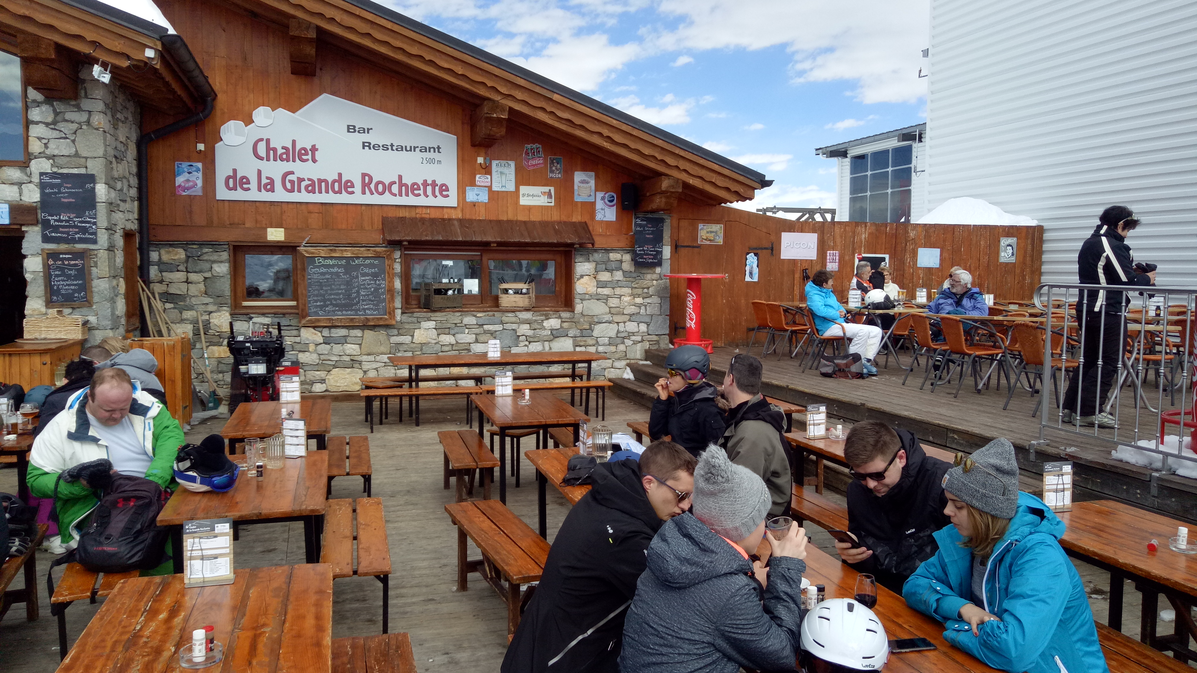 Nous avons pris un verre ici et nous avons également déjeuné ici. Je recommanderais cet endroit pour prendre un verre plus que pour le déjeuner. La nourriture a mis beaucoup de temps à arriver et était assez chère. Le restaurant est juste à côté de l'ascenseur donc c'est sympa. De plus, il y a du soleil ici jusqu'au soir alors si vous êtes à La Plagne Centre sans soleil, prenez le télésiège de la Grande Rochette ici pour prendre quelques verres au soleil !