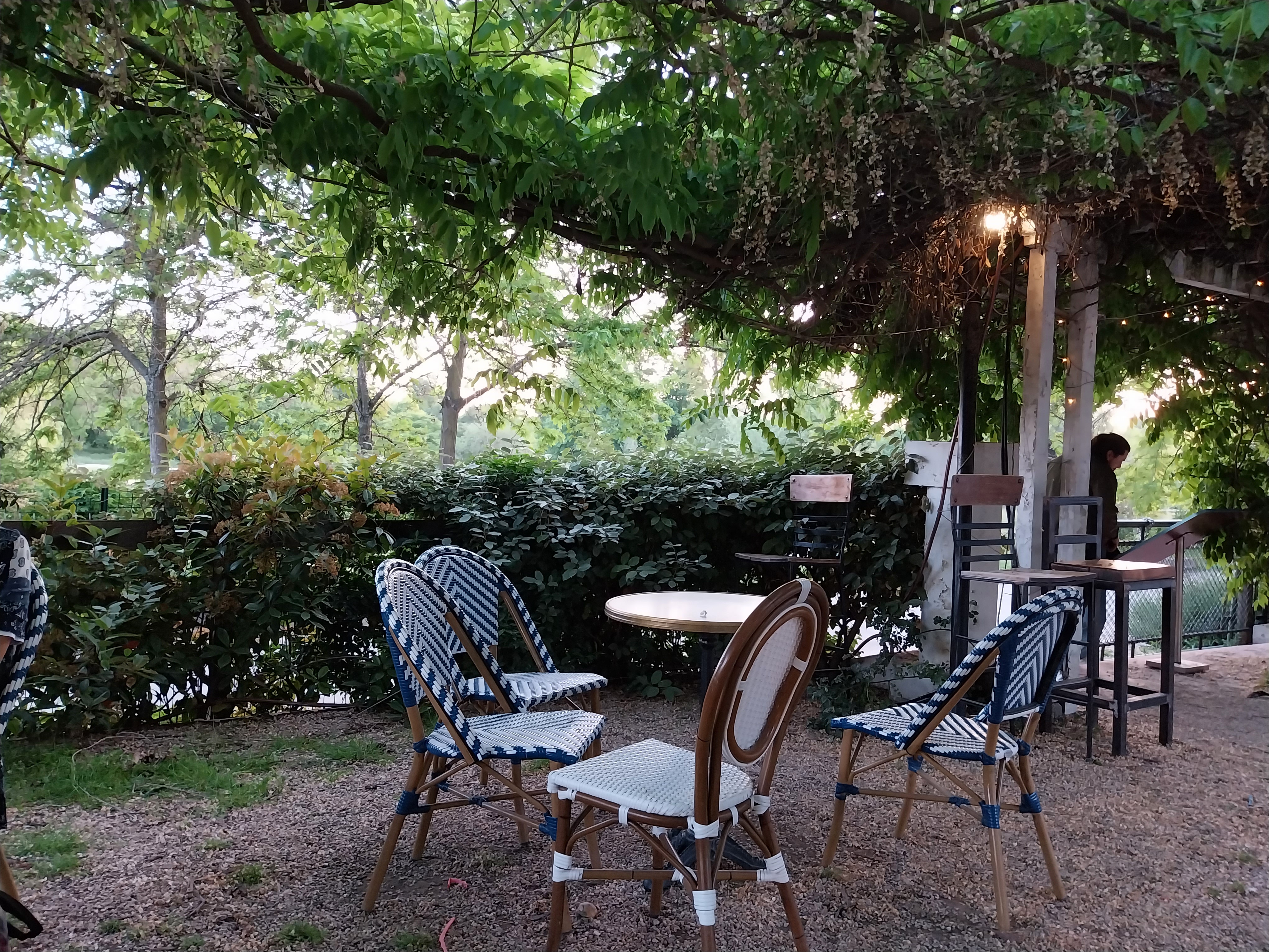Lieu au top, apaisant et fleuri mais mobilier moins comfortable (bancs en bois et chaises de bistrot) ♿️🅿️