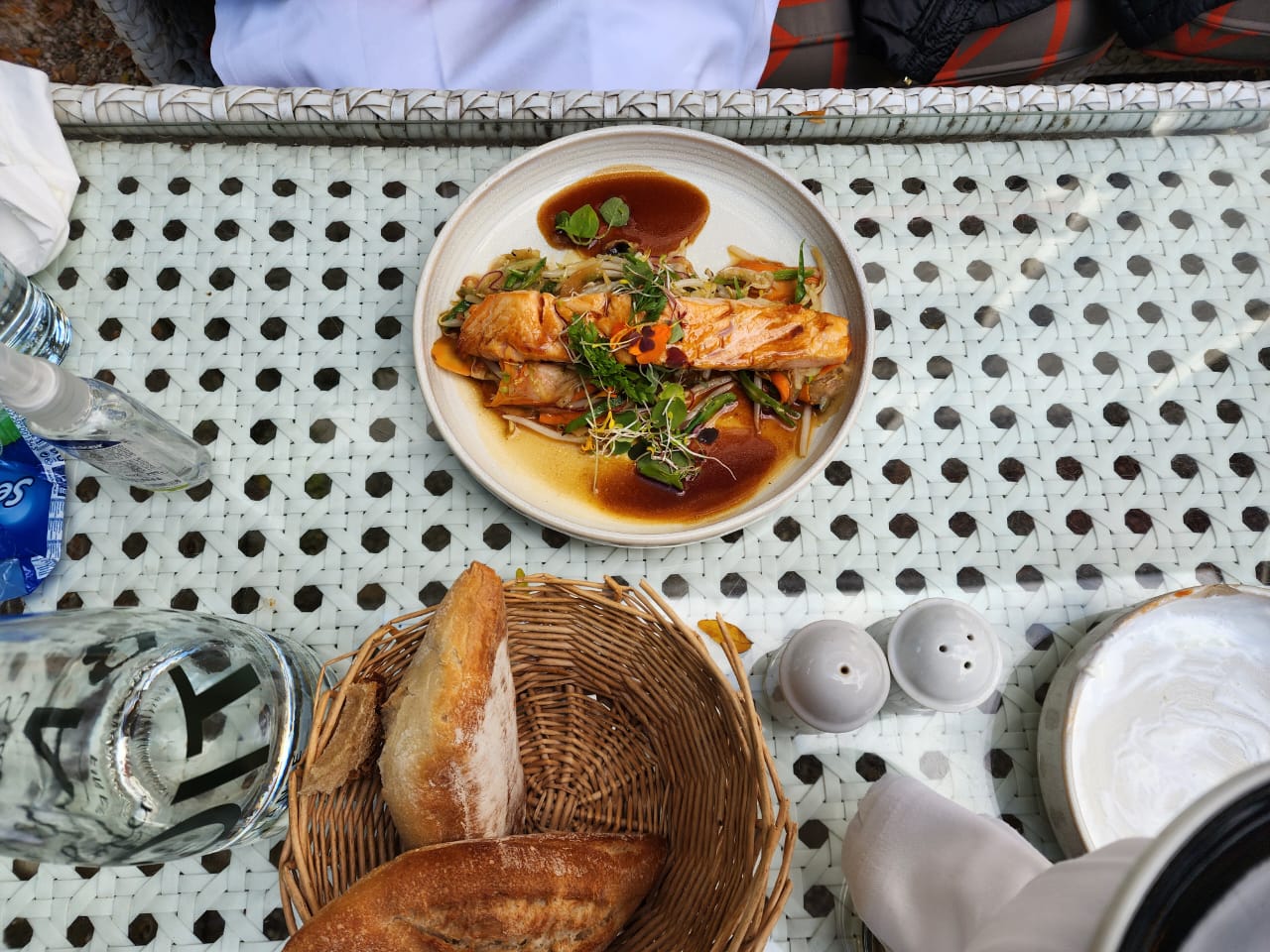 Les plats sont standards par rapport aux prix. Du coup je trouve ça vraiment cher pour ce qui est proposé. Je ne suis pas en train de dire que ce n'était pas bon mais par rapport aux prix, on s'attend à plus de saveurs et de recherche. J'ai mangé des linguines au saumon. C'est un plat que je peux faire moi-même les pâtes n'étaient pas assaisonnées, elles étaient à l'eau et au beurre, il y avait une sauce à la tomate sous le saumon, rien d'extraordinaire et trois feuilles de salade. Le plat wok de légumes et tofu était trop salé. Le service n'était pas au top encore une fois par rapport aux prix et au standing attendu dans cet environnement. On était 8, on a payé dans les 400€. On a prix des entrées à partager du vin des boissons des plats et desserts puis un peu plus tard les cafés. Lorsqu'on a demandé une carafe d'eau tout à la fin et une cuillère, on a attendu assez longtemps l'eau et la cuillère on ne l'a jamais reçue. Je pense que notre contribution méritait un peu plus d'attention.