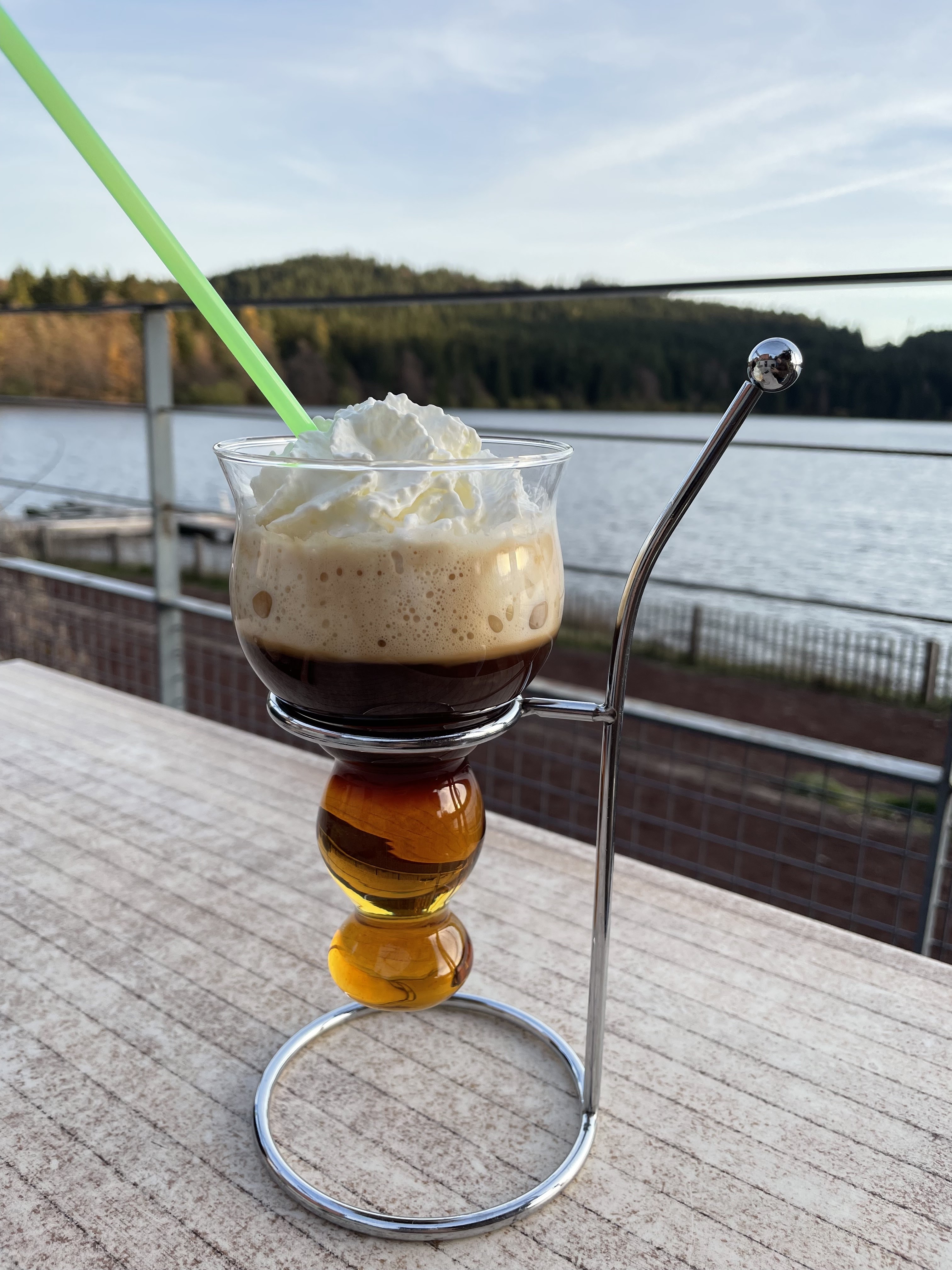 On a commandé des boissons, Panorama très jolie avec le lac mais il faisait un peu froid mais la serveuse était très sympa et drôle.