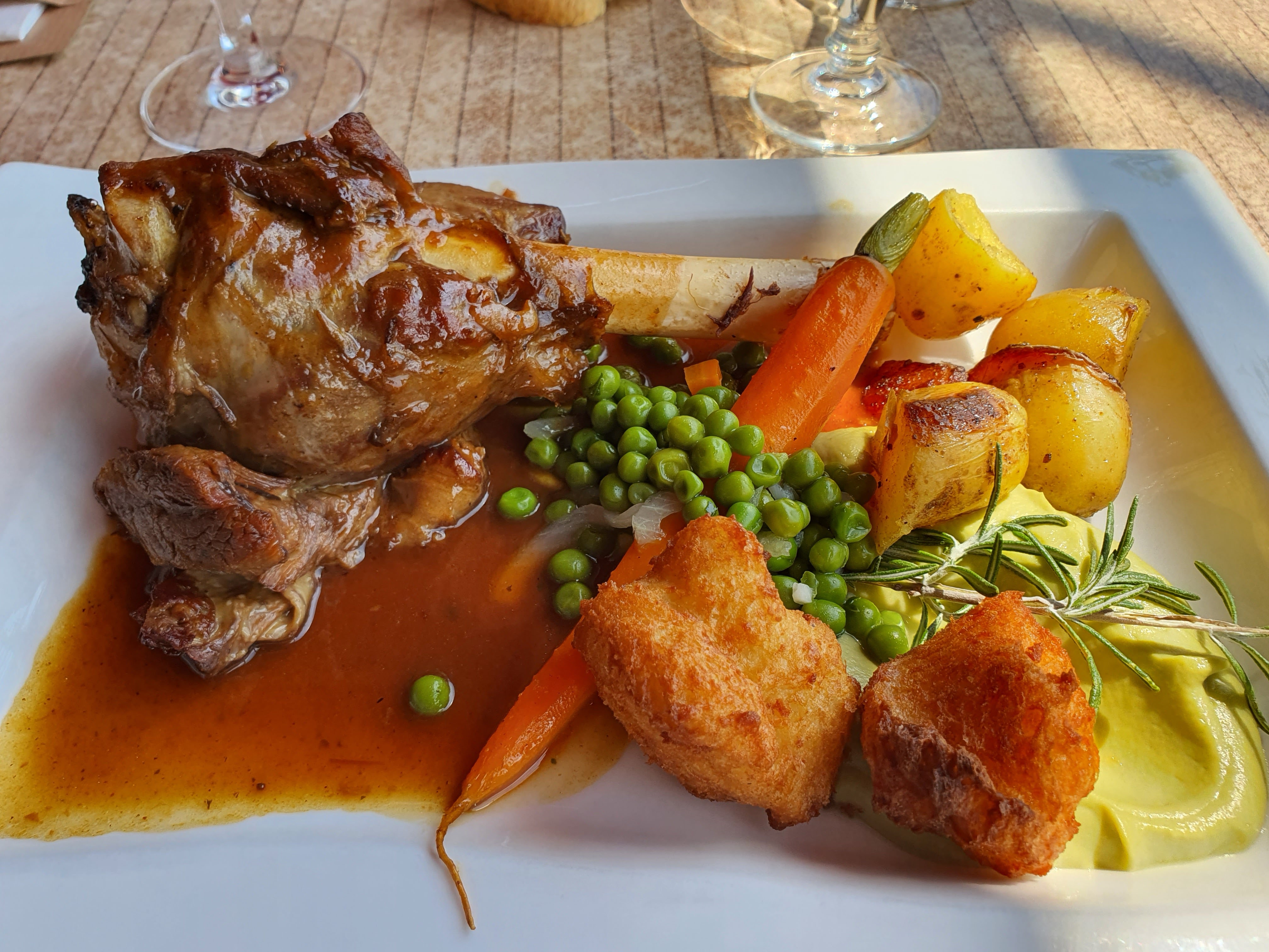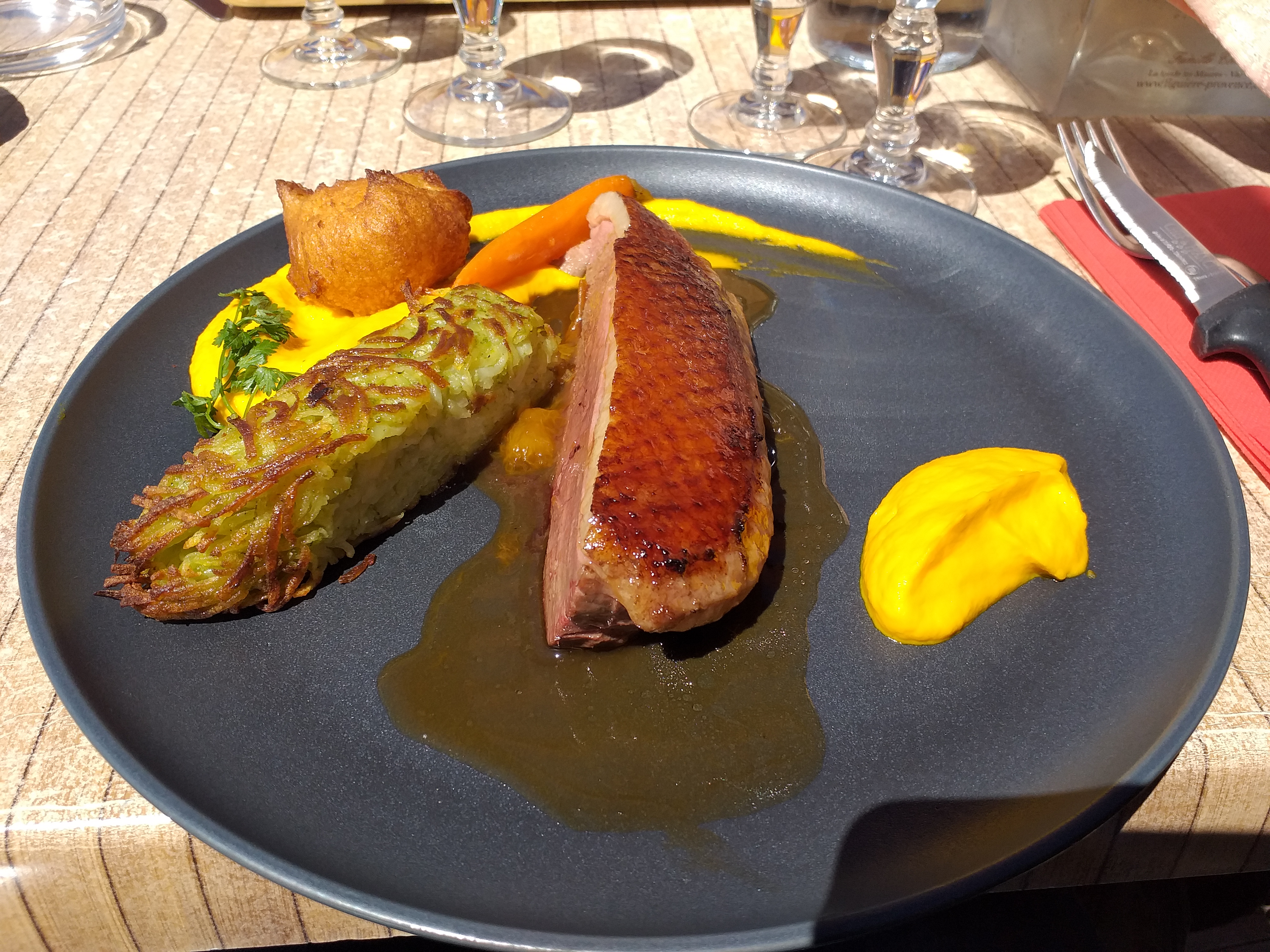 Tres bon restaurant dans un cadre magnifique Prix raisonnables. Les assiettes sont bien remplies. Viande tendre. La personne qui s'est occupée de nous a pris le soin de nous décaler d'une table pour que nous ne soyons pas au soleil dans que nous ayons eu besoin de le lui demander.. Nous avons apprécié le geste..