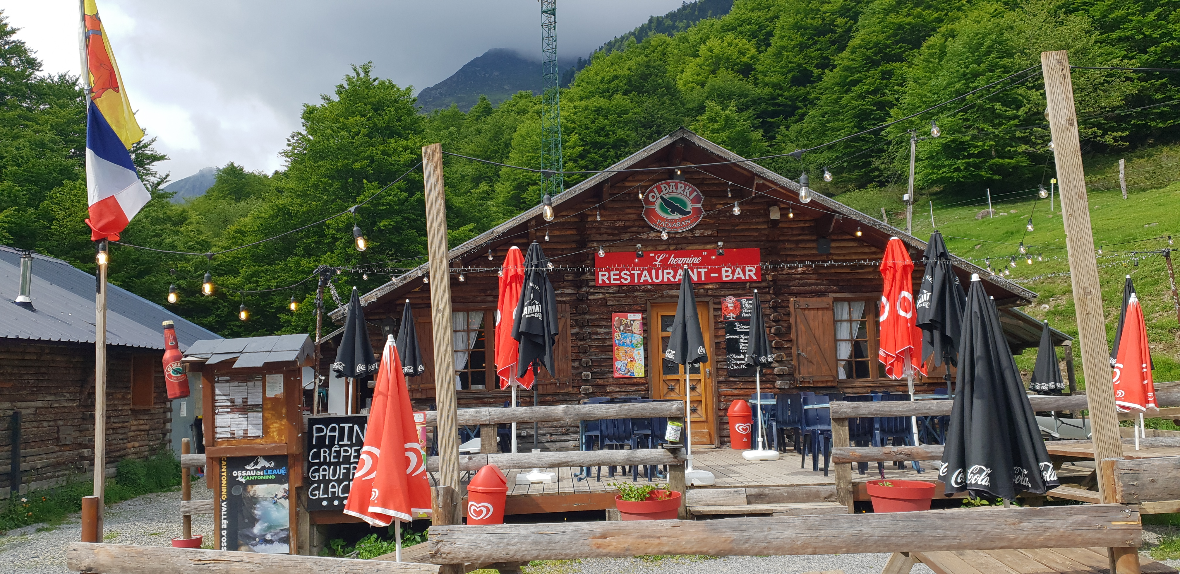 Petite auberge de montagne, dans un chalet en bois avec de nombreuses tables en terrasse, à Pont de camps, en vallée d'Ossau, qui propose un choix de plats simples et copieux (exemple entrecôte ou côtelettes d'agneau), de très consistants sandwichs et omelettes et de bonnes crêpes