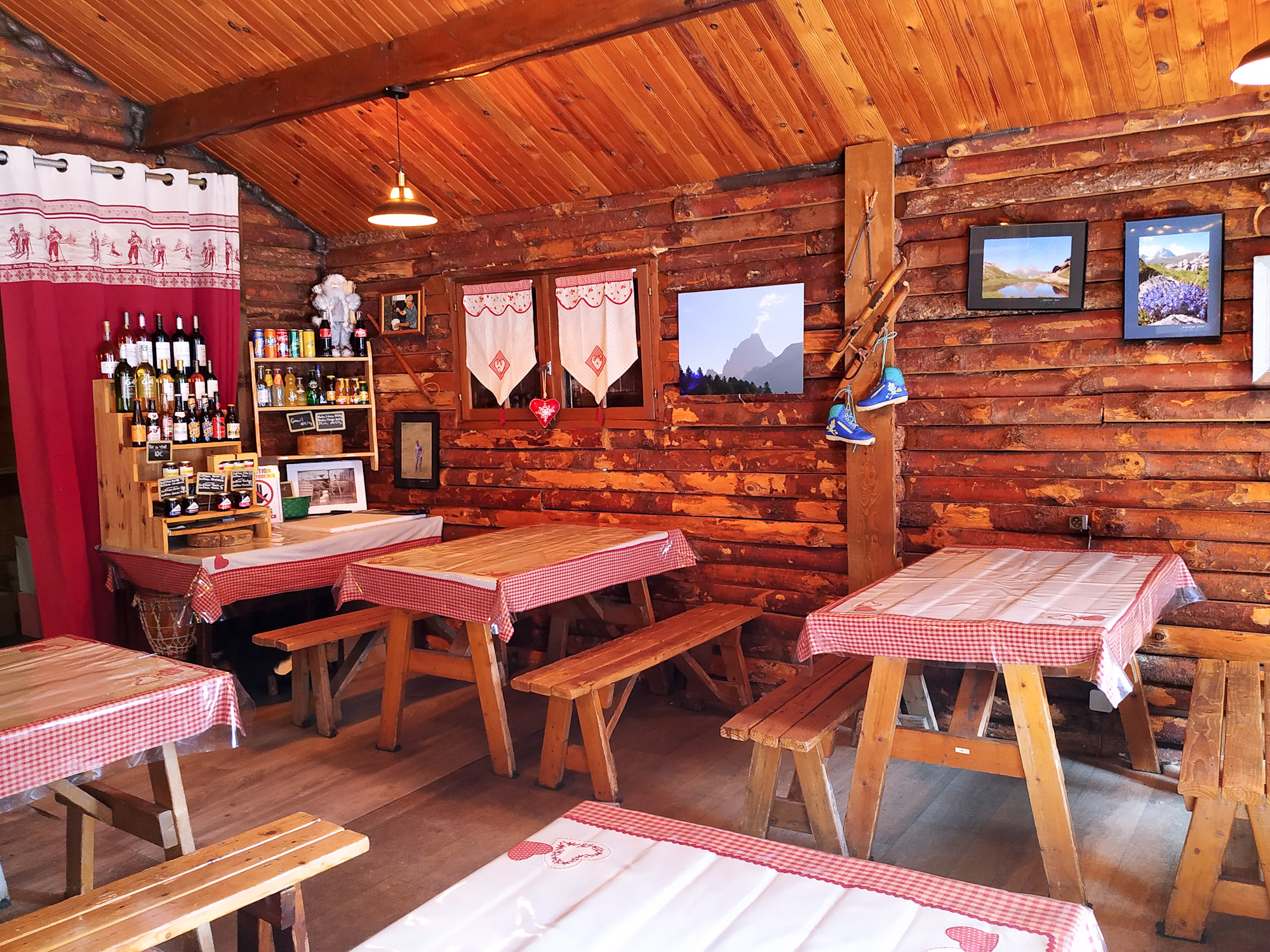 Chalet authentique et cuisine française et montagnarde en toute simplicité ( en terrasse ou en intérieur (environ 30 couverts) : goûteux et copieux. Accueil sympathique e5 prix abordables.