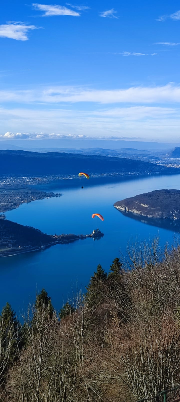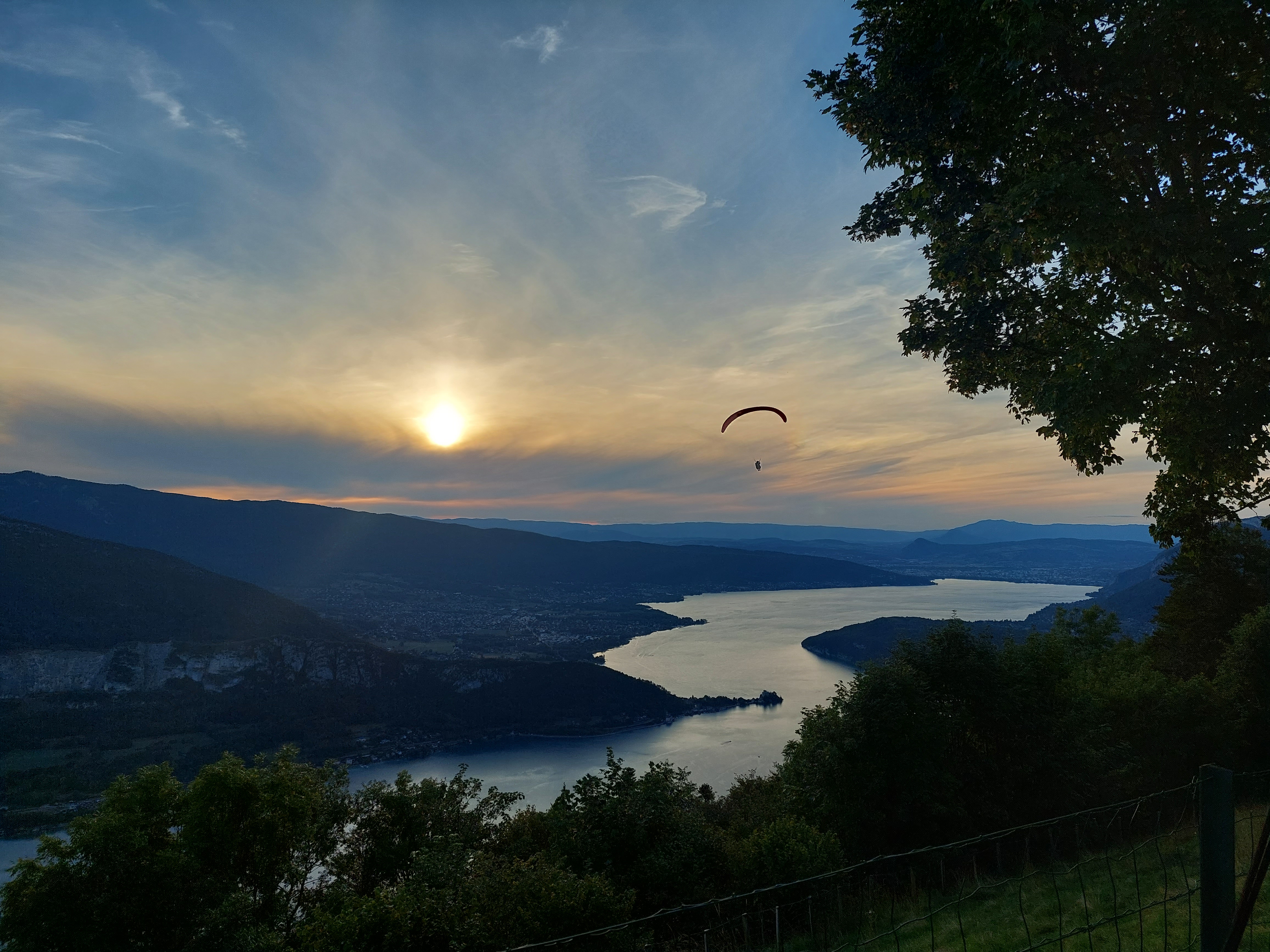 Une vue exceptionnelle sur le lac et les parapentes qui décollent juste au dessus. Les plats sont très bons, le service très agréable, une très bonne adresse je recommande !