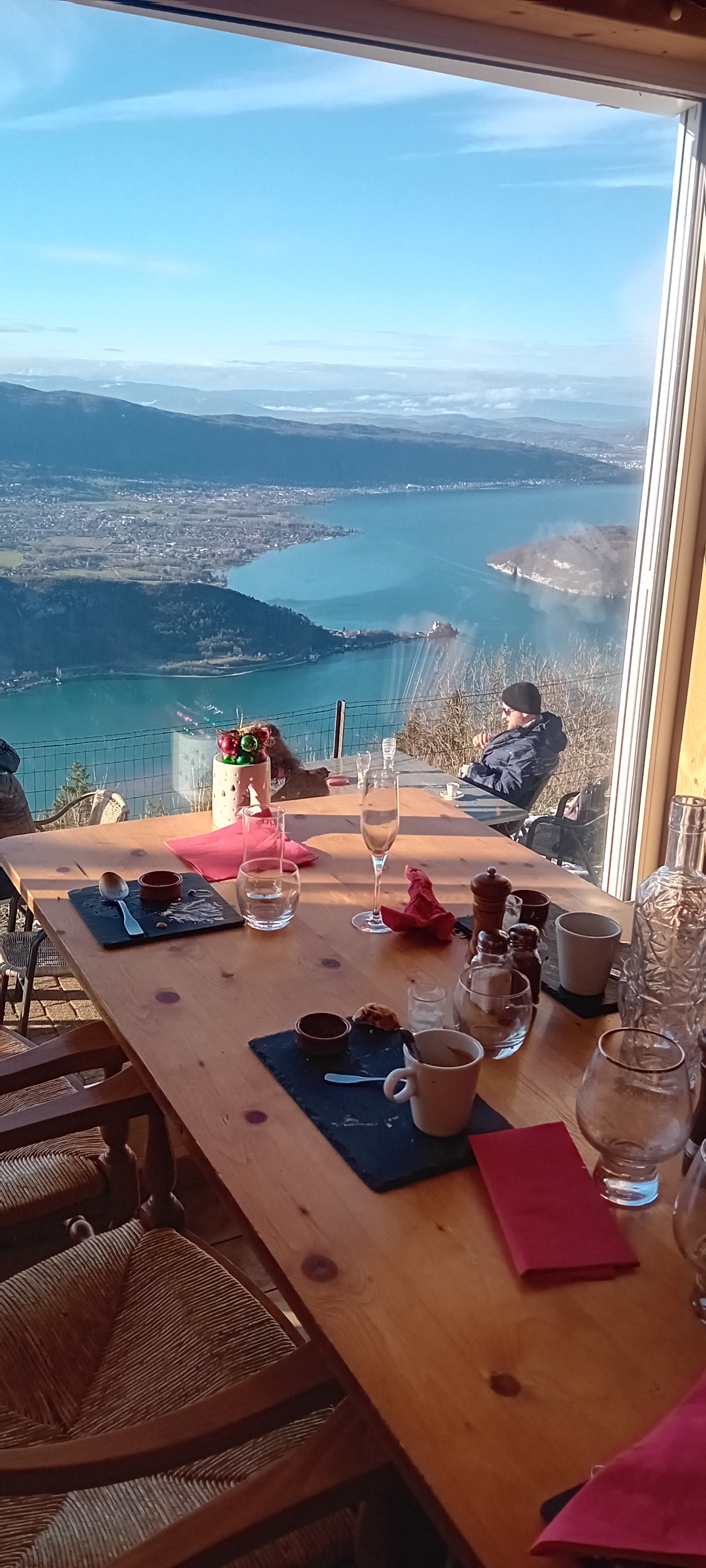 Nous avons passé un très bon moment au sein de ce restaurant proposant des plats gourmands et copieux. La vue sur le lac d'Annecy est extraordinaire et à couper le souffle. Comme un spectacle de la nature le temps d'un instant. De plus, lorsque la soirée s'est rafraîchie, on nous a proposé des plaids bien chauds en terrasse. Autre point positif le service était agréable et convivial. Nous vous recommandons vivement ce lieu !