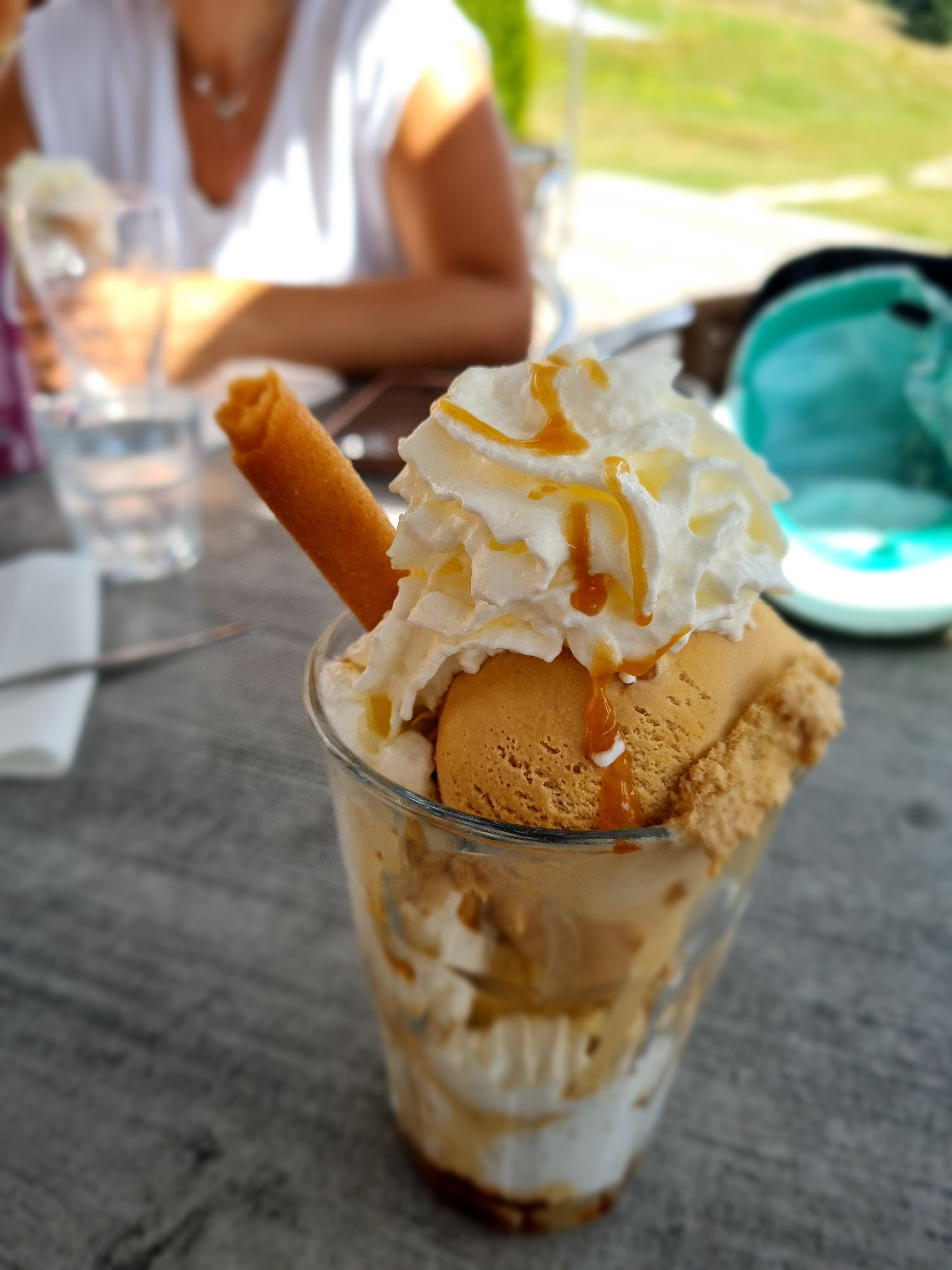 Après une bonne randonnée un goûter gourmand avec une coupe de glace au caramel