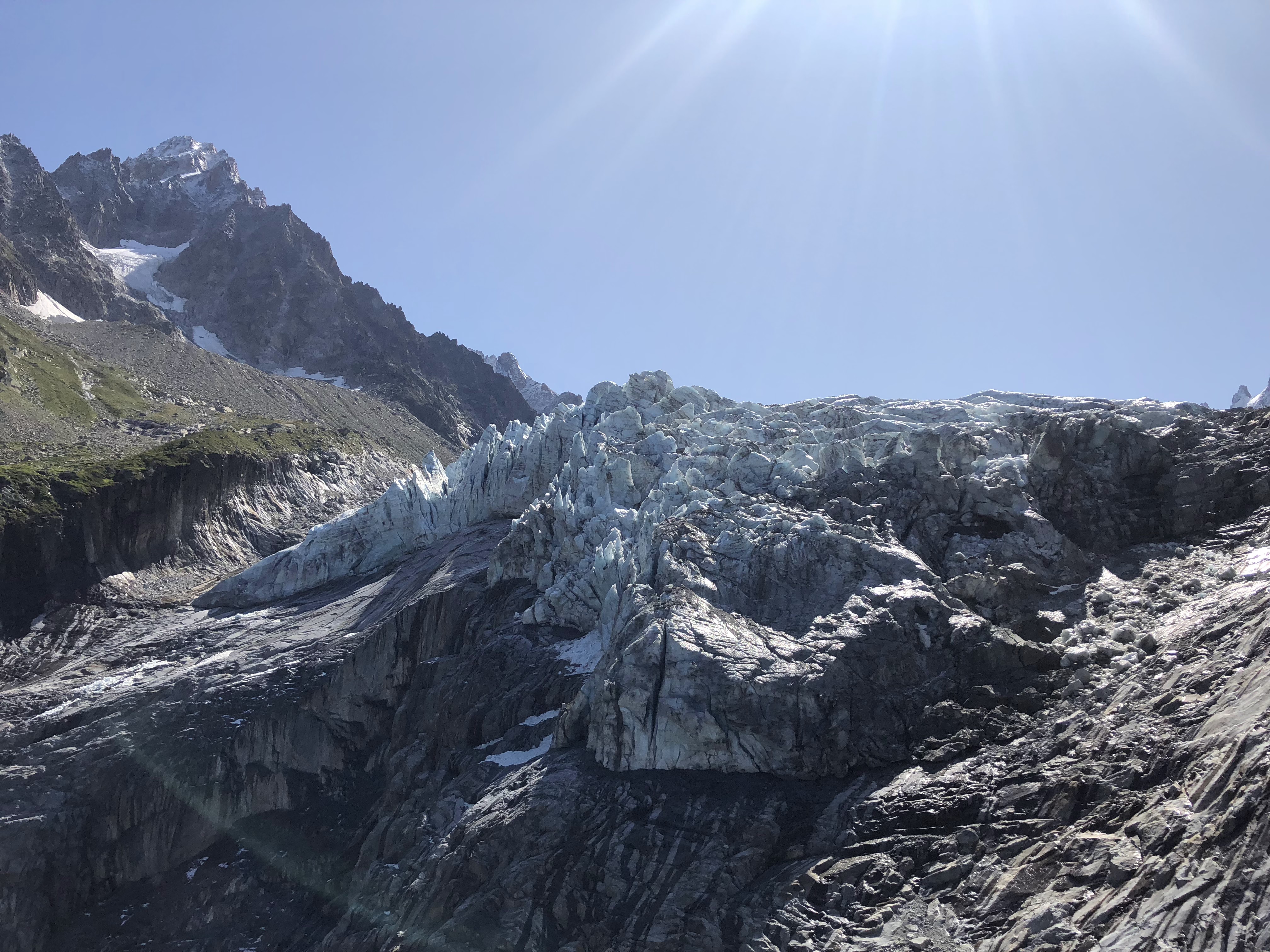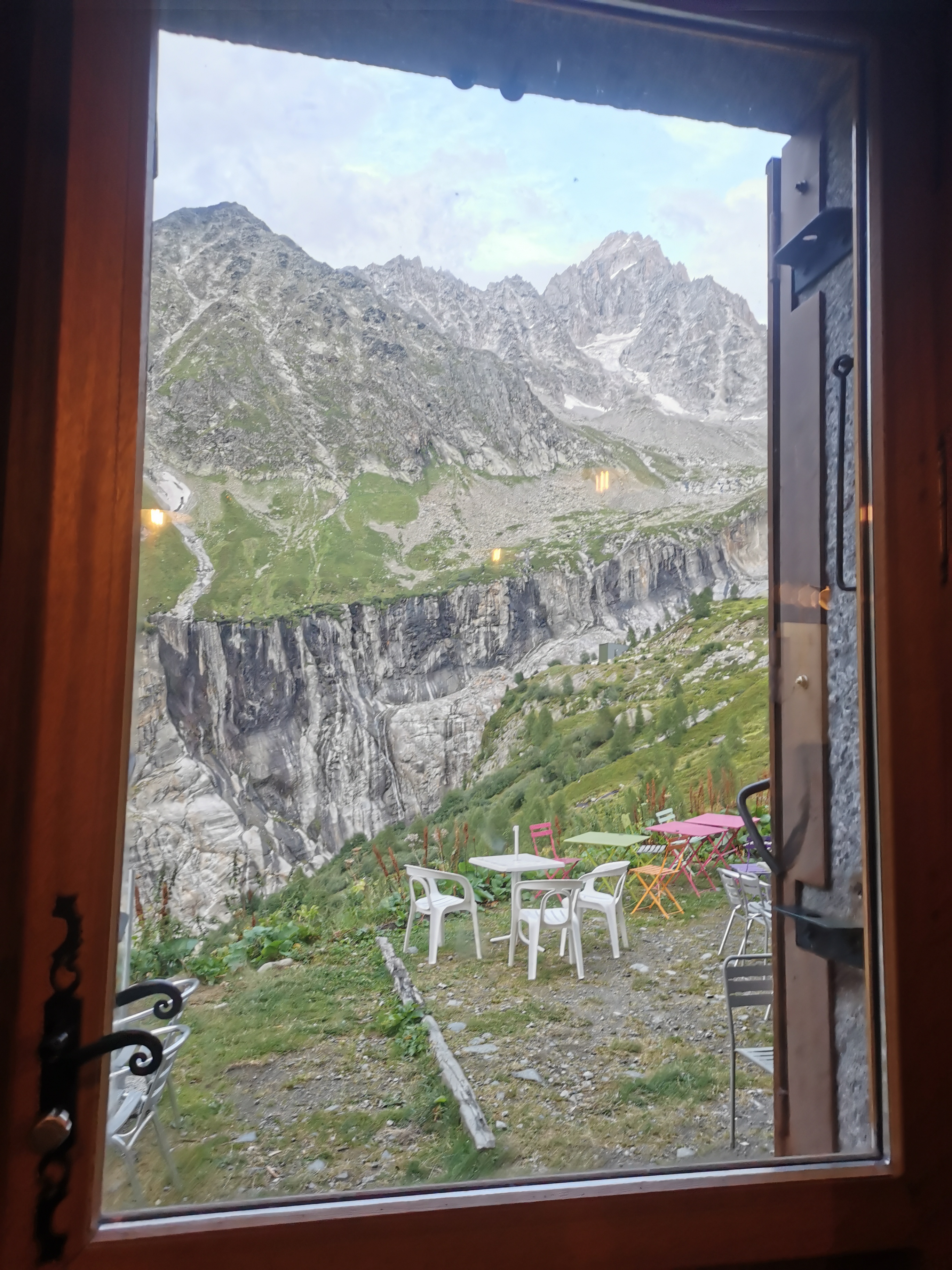 Vue imprenable sur le Glacier d'Argentière depuis le refuge. Refuge tranquille avec chambres plutôt qu'un dortoir. Nous avons dépensé quelques monets magocs ici sur la terrasse en profitant des cascades, des chamois au loin et des glaciers craquant dans la masse bleue et glacée.