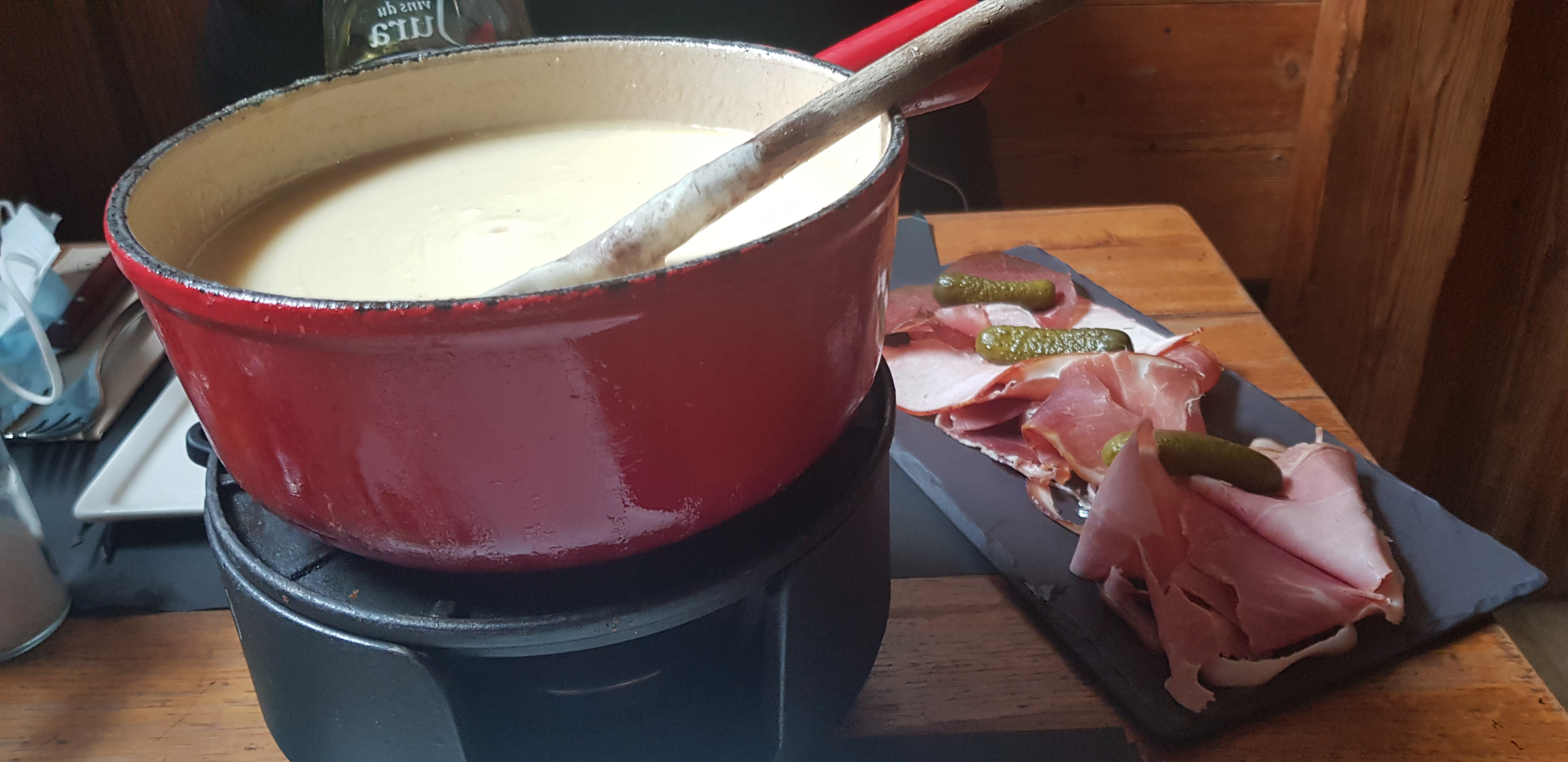 Une bonne fondue, un pain un peu trop rassis, dans le seul restaurant ouvert alentour en cette demie saison alors que la neige est déjà là.