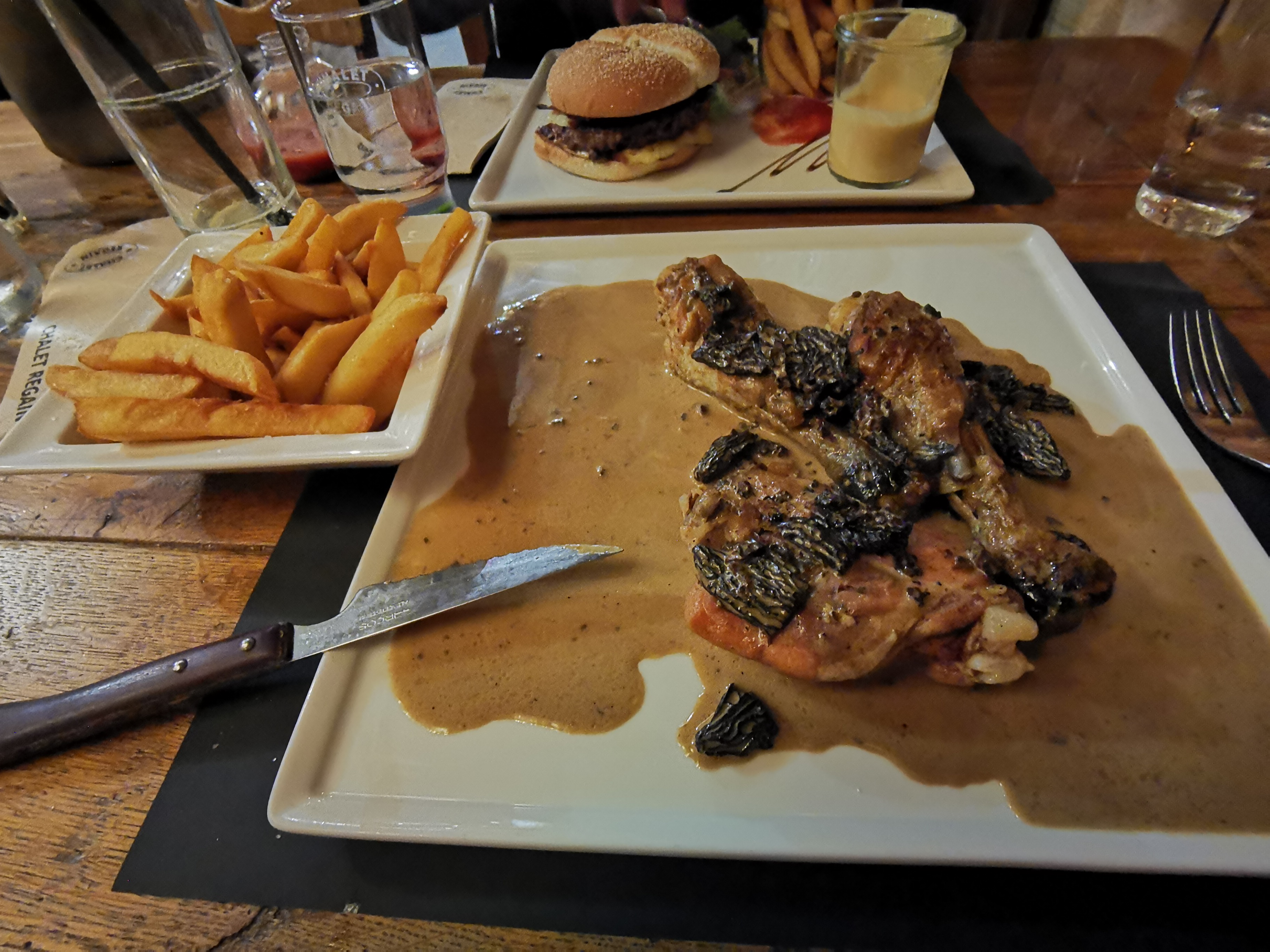 Service vraiment très long (1h30 pour le plat). Concernant le plat, la viande était vraiment excellente (poulet en cuisson 7 heures), la sauce aux morilles était aussi très bonne (dommage que pour un repas en novembre, qui est la période des champignons on vous serve les seuls champignons cueillis au printemps). Dommage aussi les frites surgelées et l'absence de légumes comme vous pouvez le voir sur la photo. Le steak haché Angus du burger de l'autre plat était vraiment excellent (cuisson: rosé au centre et bien grillé tout autour: bravo !)