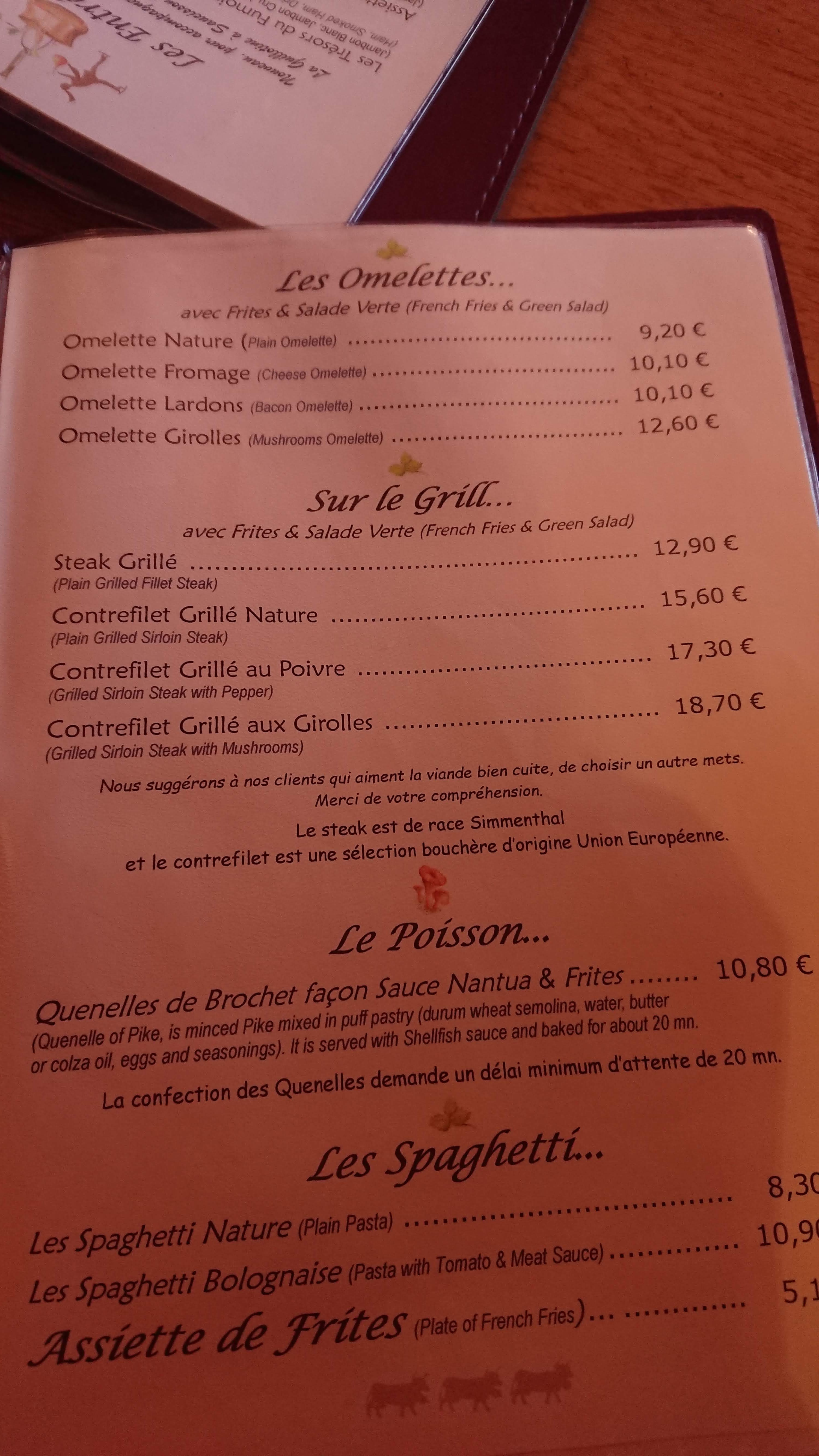 Le menu propose un grand choix de plats. A l’heure du déjeuner il y a beaucoup de monde, très bondé. Un gars très rapide – un serveur. J'ai aimé l'omelette et le steak. Nous avons déjeuné deux fois ! Je recommande de venir le midi !