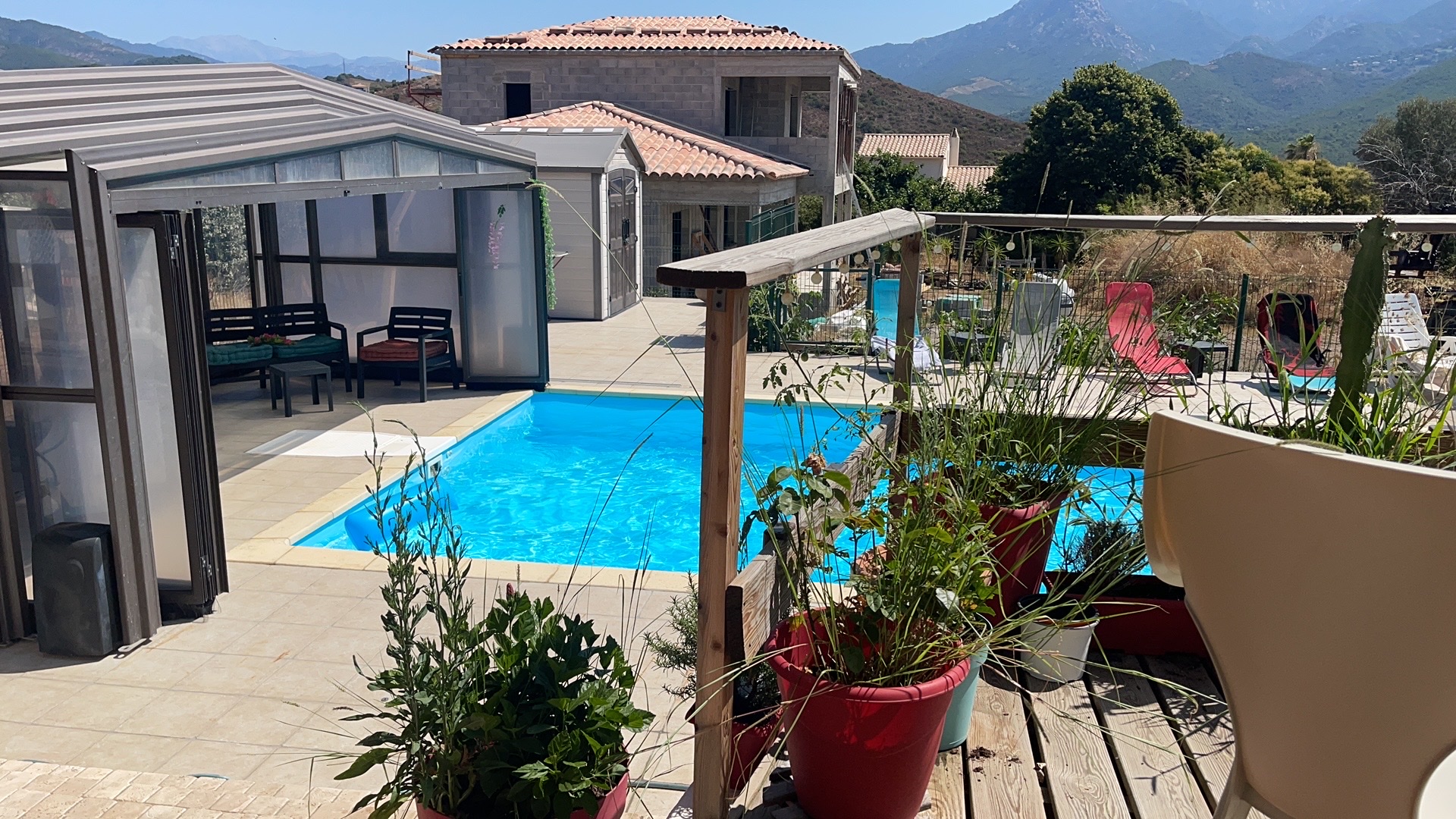 Piscine, jacuzzi, salon d'été perdus dans le maquis. Le couple d'hôtes Elisa & Patrick, est très accueillant et s'occupe seul des 5 chambres de ce chalet zen.