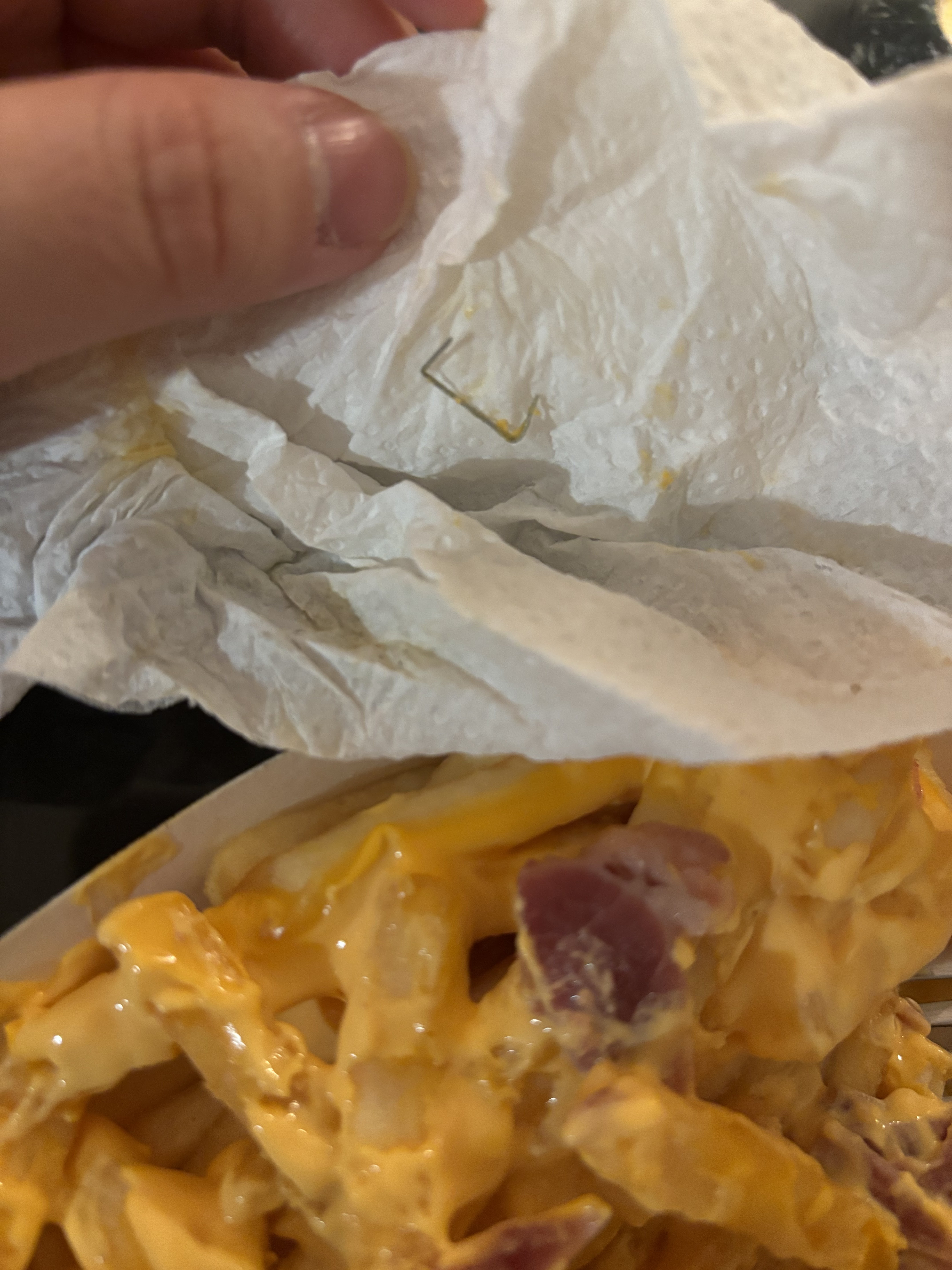 C’est la première fois que je commande chez chamas tacos. 1) un article manquant dans la commande. Réclamation faite auprès du service de livraison. 2) j’ai retrouvé une agrafe dans la barquette de frite cheese bacon !!! Je vous laisse soigneusement regarder la photo ….. c’est incroyable et inadmissible…!!!!