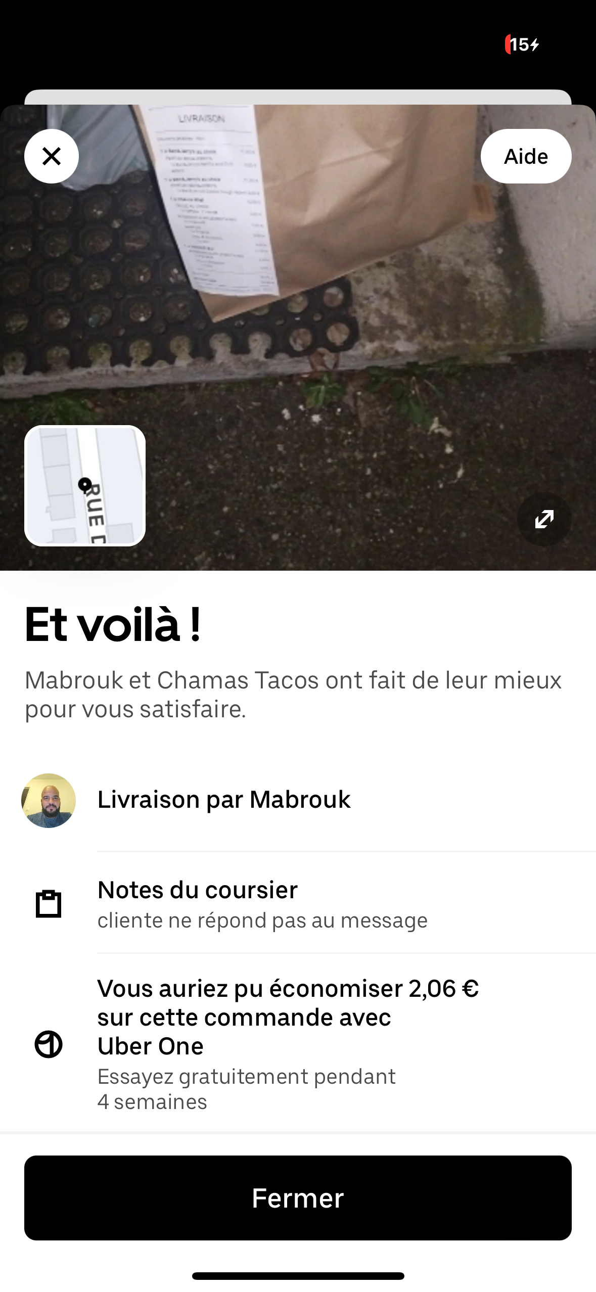 Ma commande a été laisser dehors sur le bord d’un trottoir! Je ne l’ai pas reçu ! Je n’ai pas reçu d’appel ou de message de la part du Uber Eat ! ( MABROUK) Avoir payer 50/60 euros de commande pour au final ne pas pouvoir y toucher ! Je souhaites avoir la totalité de la commande ou le remboursement complet !