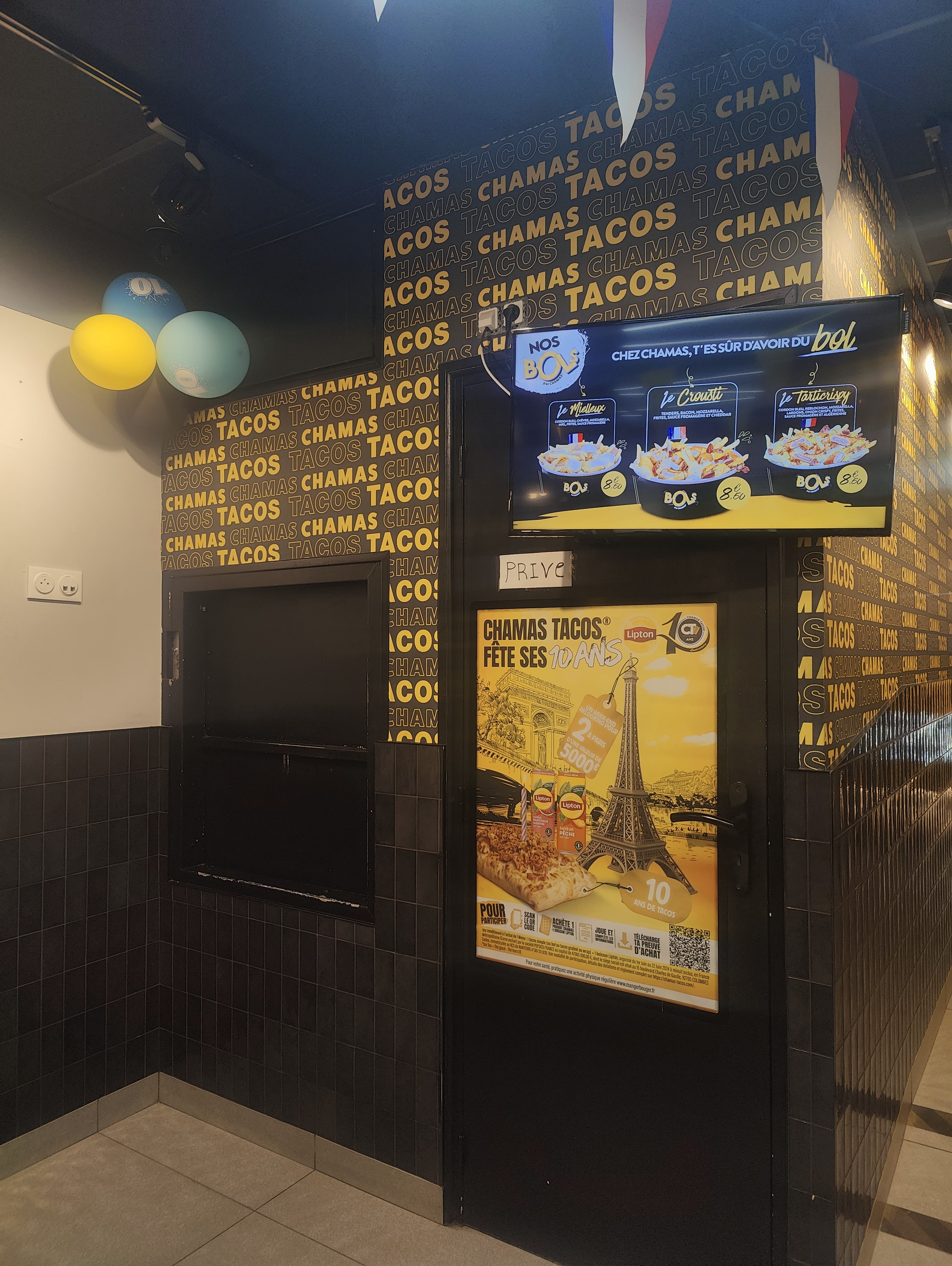 Je suis venue dans l’espoir de retrouver le goût du vrai tacos Chamas mais très grande déception, le tacos est fade, rempli de frites, et le poulet est mariné avec du curry seulement. La sauce blanche n’a pas de goût et sauce algérienne demandée mais quasi introuvable dans le tacos. Bref, on avait eu pour supplément, une odeur nauséabonde qui se dégageait des toilettes de l’établissement. A fuir !