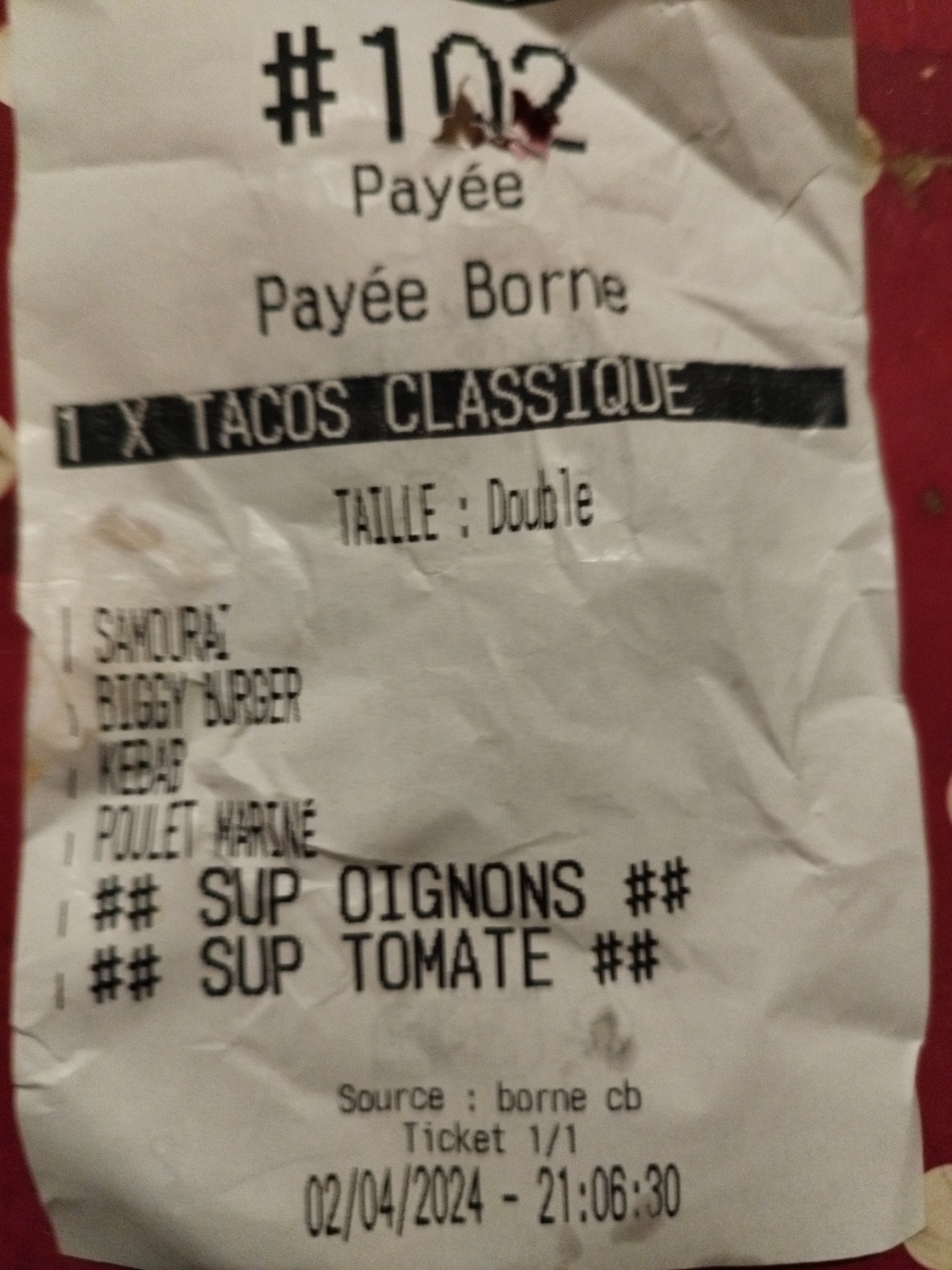 Bonjour, commande 102 de ce soir 02/04/2024...Tacos excellent mais j'ai payé un supplément oignons pour rien car ils n'y en avaient pas dans mon tacos!!! Cuisine rien à dire hormis le manque du supplément payé pour rien. Service...il n'y a personne derrière la caisse avant la réception de la commande mais ça ne pose pas vraiment problème grâce aux bornes Ambiance...il n'y en avait pas du tout mais ce n'est pas un problème quand on prend à emporter