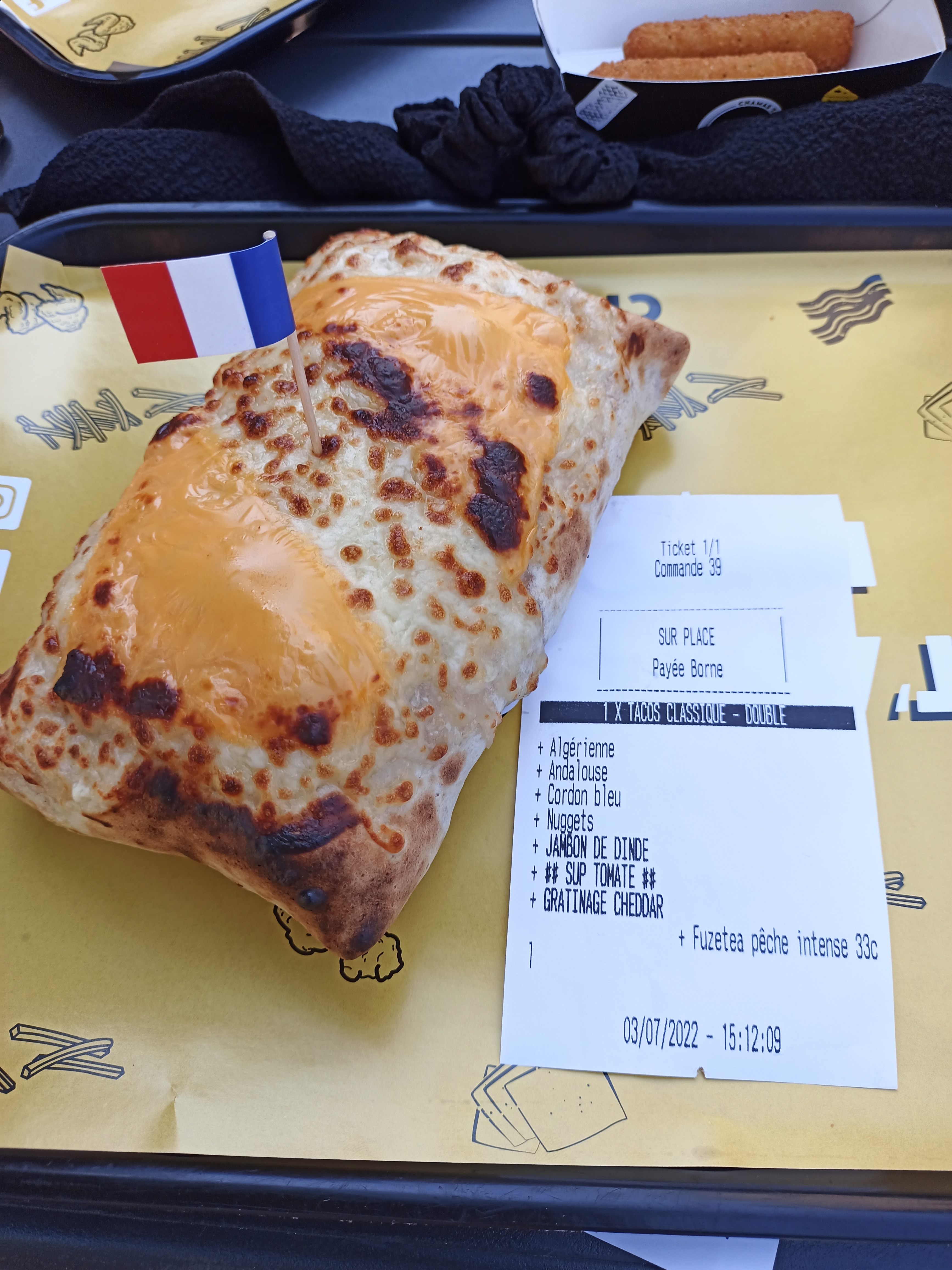 dommage j'aurais préférer finir le tacos mais quand on met 1L de sauces et 10 kg de frites et 100g de viande, ça ne donne vraiment pas envie de manger. Le seul point fort c'est l'estetique.... c'est grâce a l'estetique que je met un 2 etoiles.....
