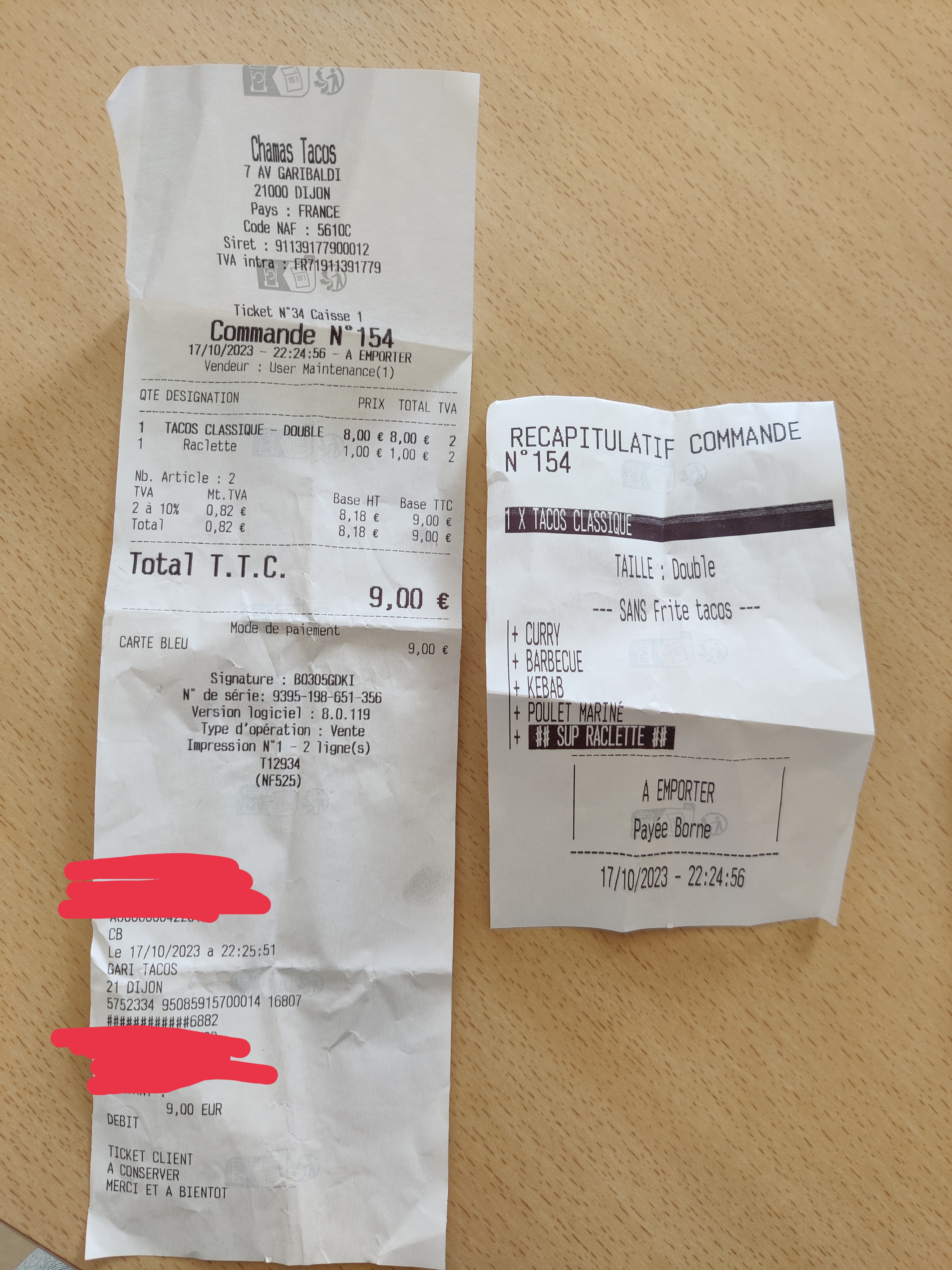 Jai commandé un tacos normal et un tacos signature suprême raclette et il était pas gratinée😞