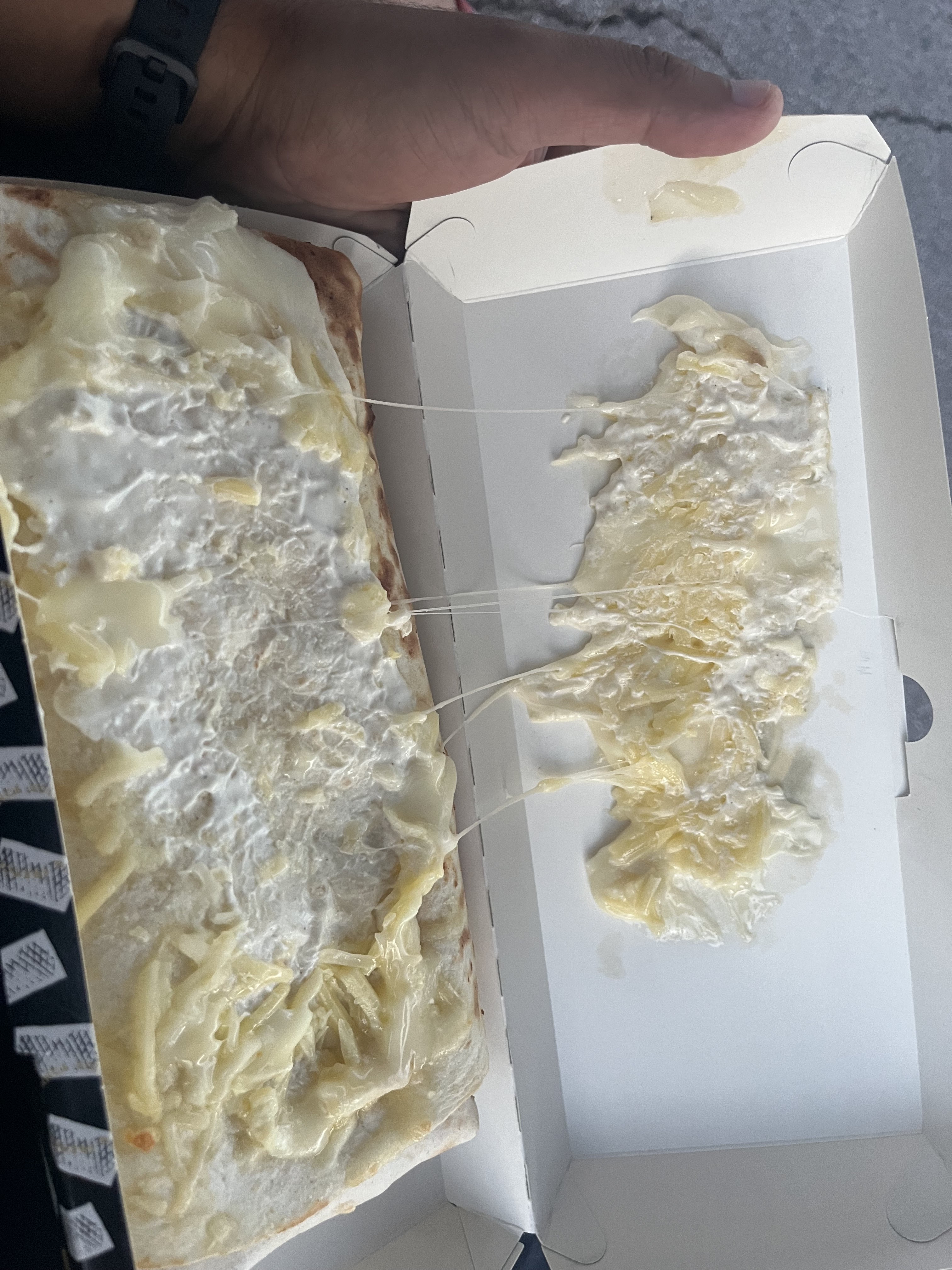 Le gratinée du tacos est tout collé à la boîte, poulet trop salé, je n’ai pas eu mon supplément reblochon à l’intérieur … pas terrible pour le prix