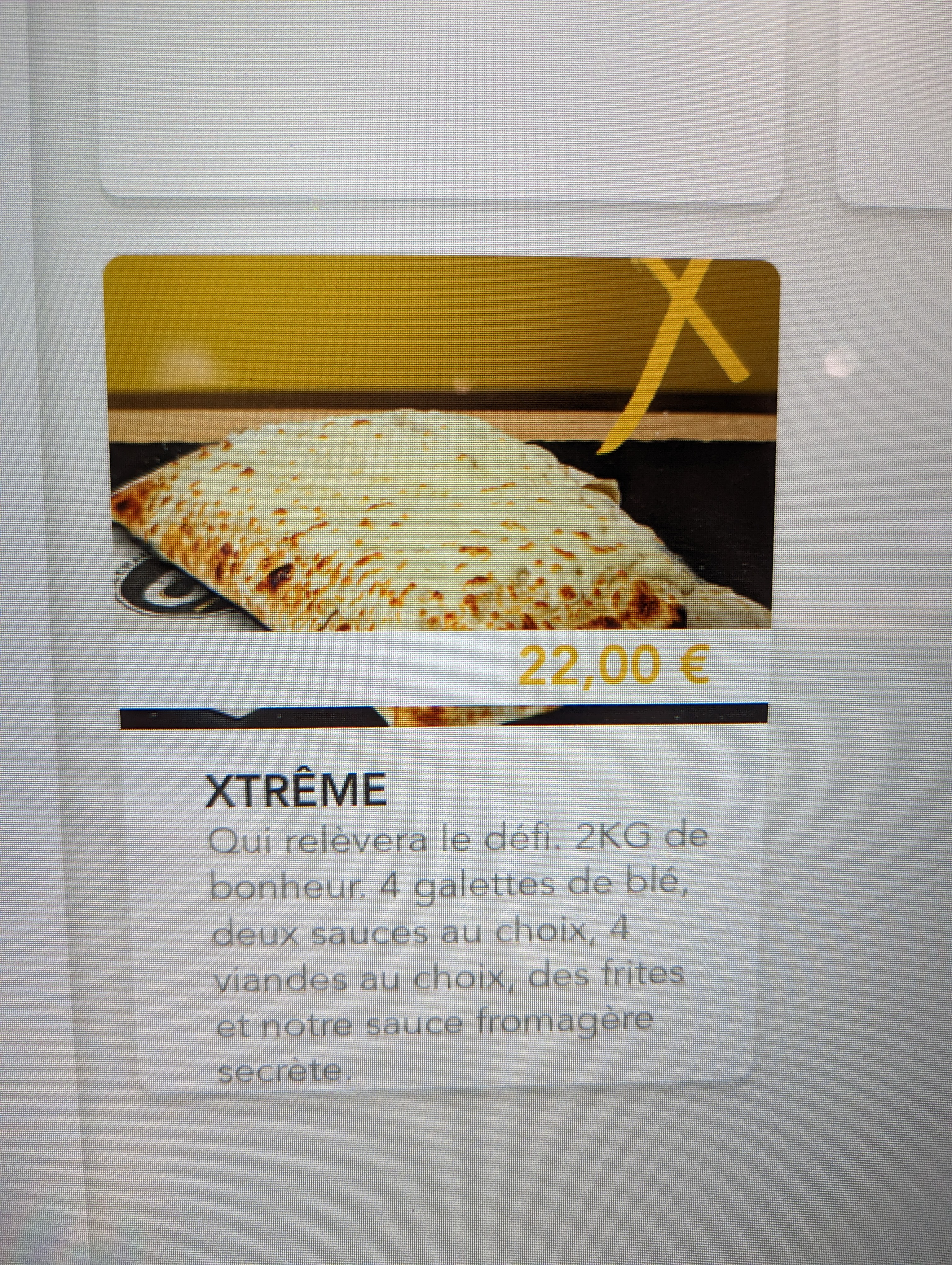 La fois où j’avais commandé c’était extrêmement sec, trop frite pas assez de sauces ect … Mais je suis quand même venu pour vous demander de quand même mettre le menu et la carte avec les prix !!? Pour que sa nous donne une idée de ce que on va dépenser.