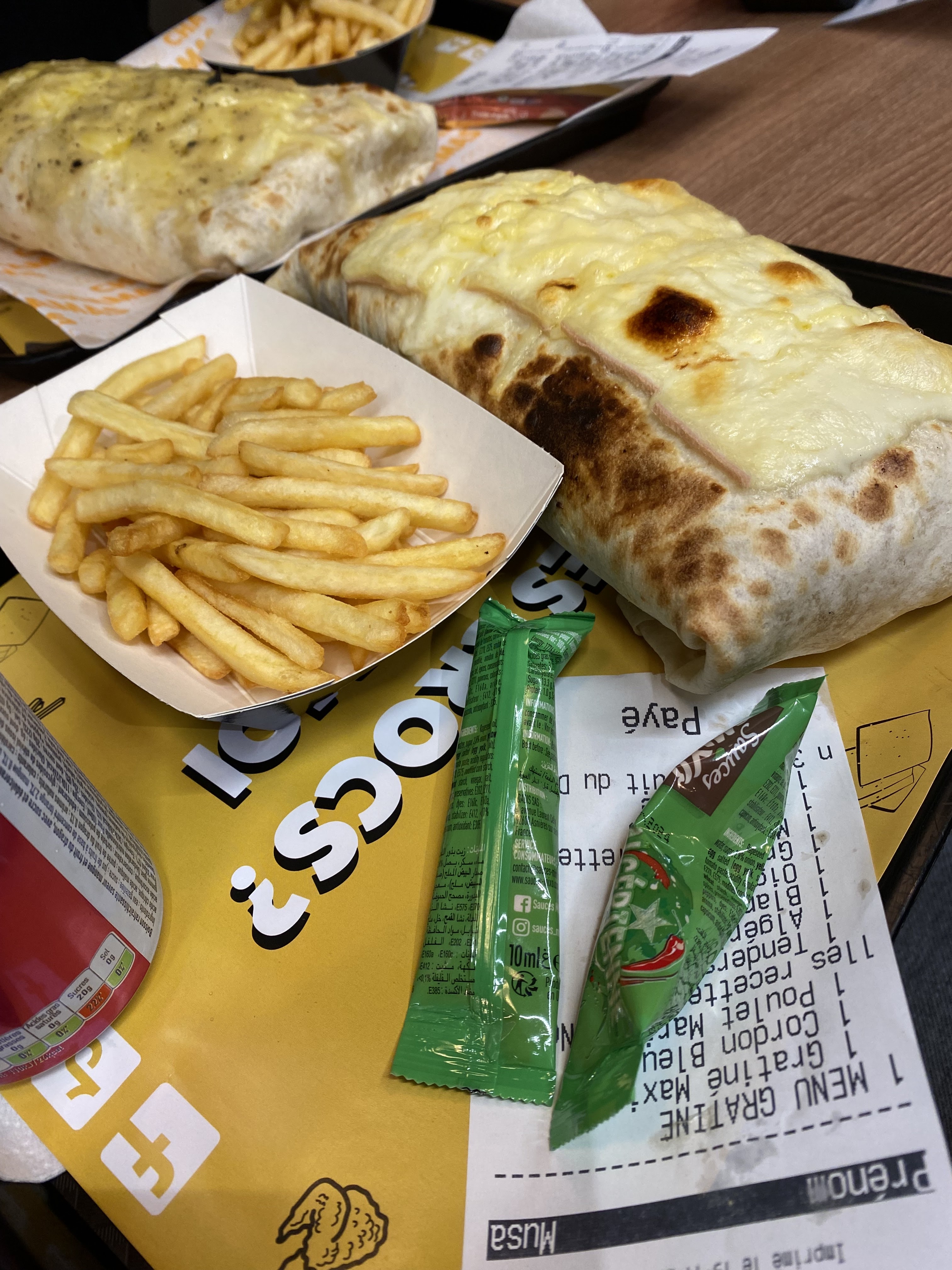 Pris un tacos gratiné a emporté. Le gratinage était immonde, le tacos était humide avec un goût de carton. Les desserts étaient pas mauvais. Je n'y mangerai pas deux fois.