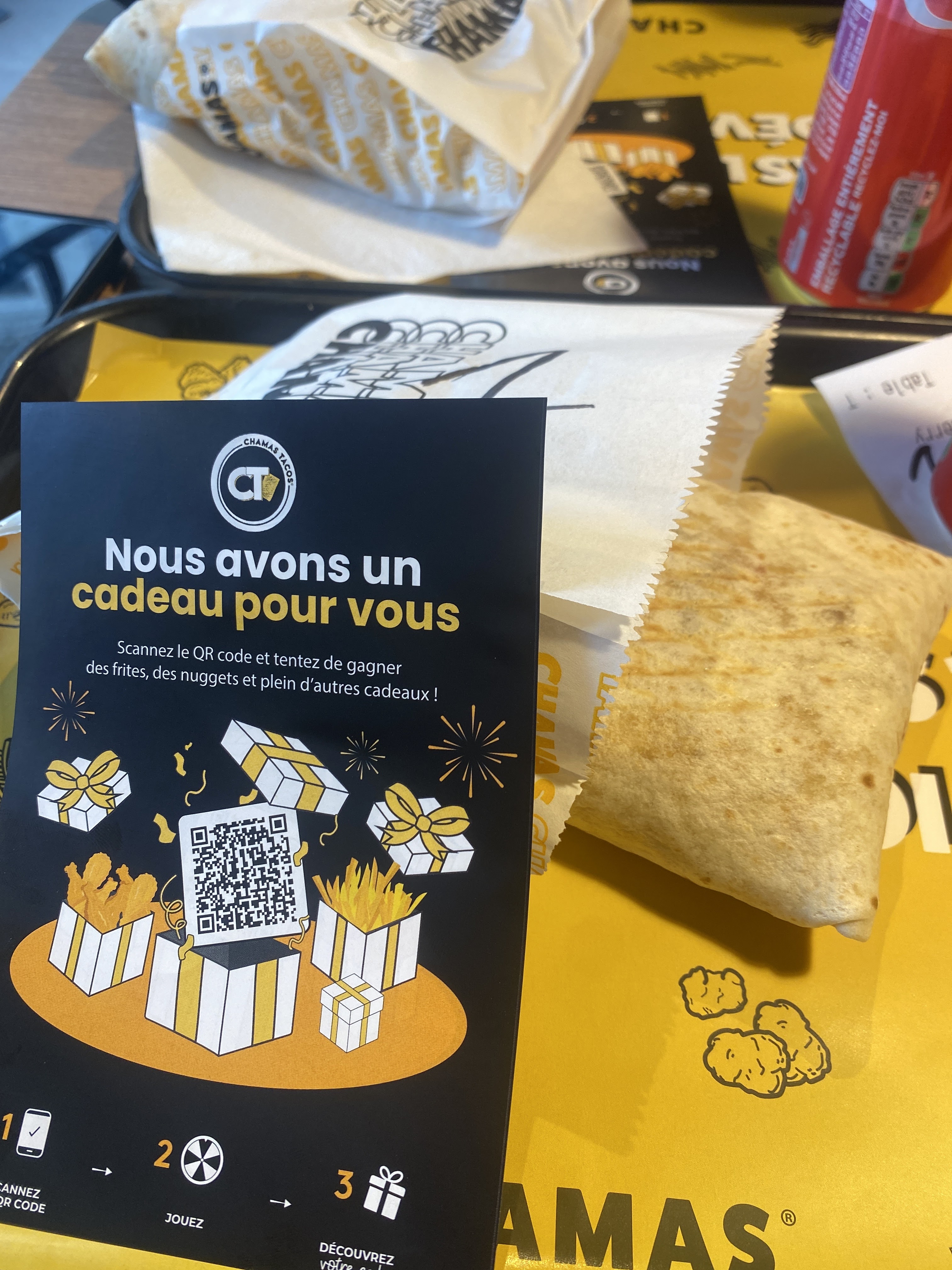 Vraiment aberrant beaucoup trop cher pour ce que c'est, la musique qui apparaît subitement en plein milieu du repas, ambiance nulle. Je déconseille fortement, les tacos ont le même goût que des frites au pain.