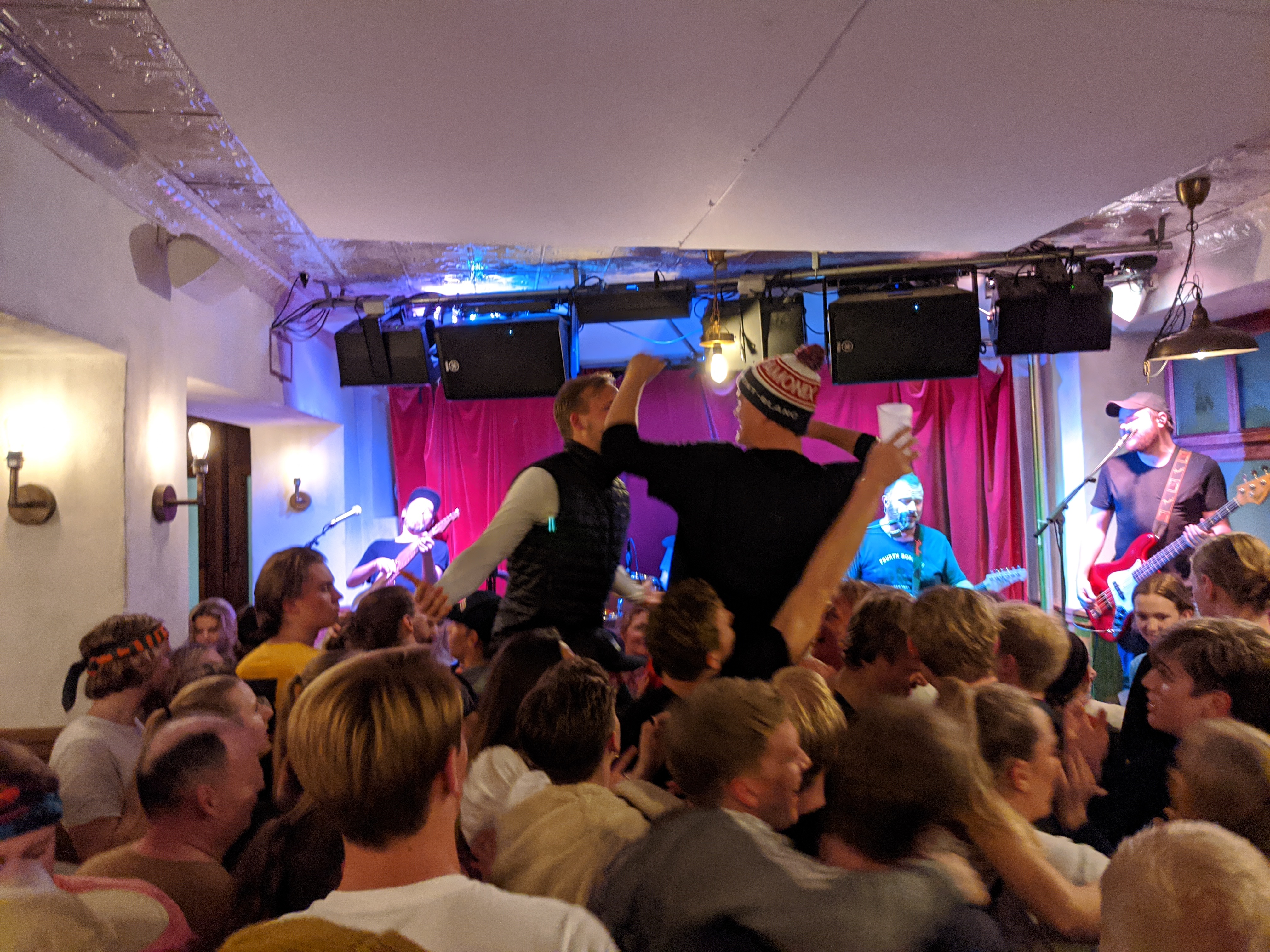 Un bon groupe live bruyant est l'attraction principale. Petite salle pleine à craquer, chaude et très animée, endroit parfait pour sauter et danser après les raideurs d'après-ski. Boissons chères. Pas de frais d'entrée. Politique « une entrée, une sortie » appliquée aux heures de pointe.