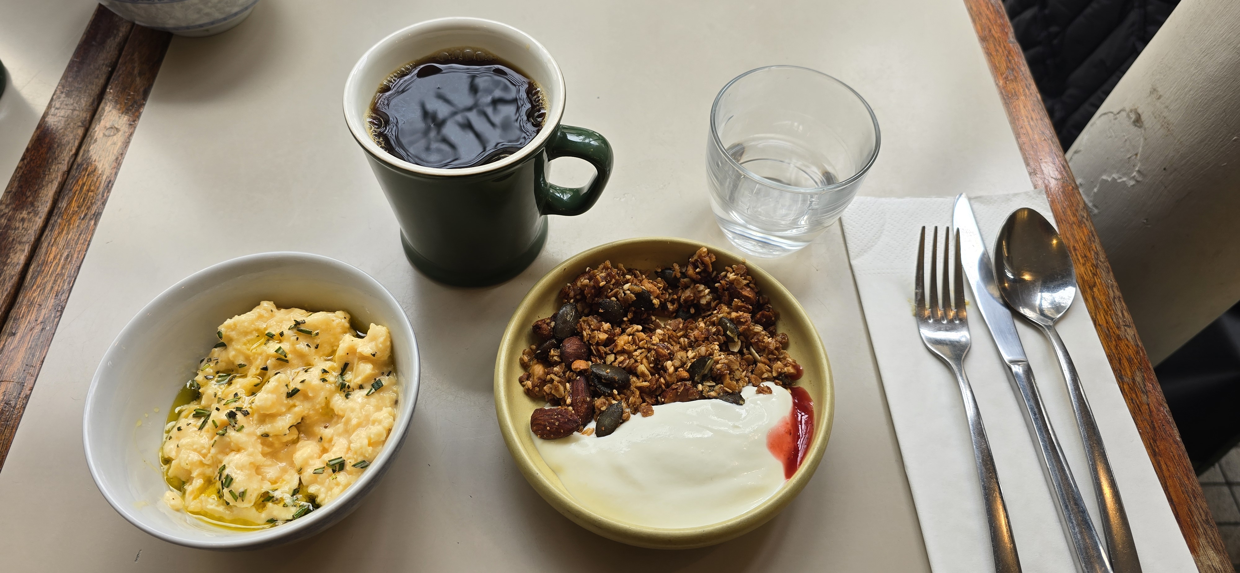 Nous avons décidé d'essayer cet endroit pour le petit-déjeuner et nous n'avons aucun regret. Leur sélection est simple et gratifiante. Nous avons eu le fromage de chèvre au paprika (chevre frais marin) et l'œuf dur accompagné de fromage cantaloup (œuf coque). De plus, nous avons commandé un expresso et du jus d'orange frais. Mme Lilou était très gentille, attentionnée et prévenante. Je vous encourage vraiment à essayer cet endroit. Ambiance chaleureuse et à côté de nombreux points d'intérêt.