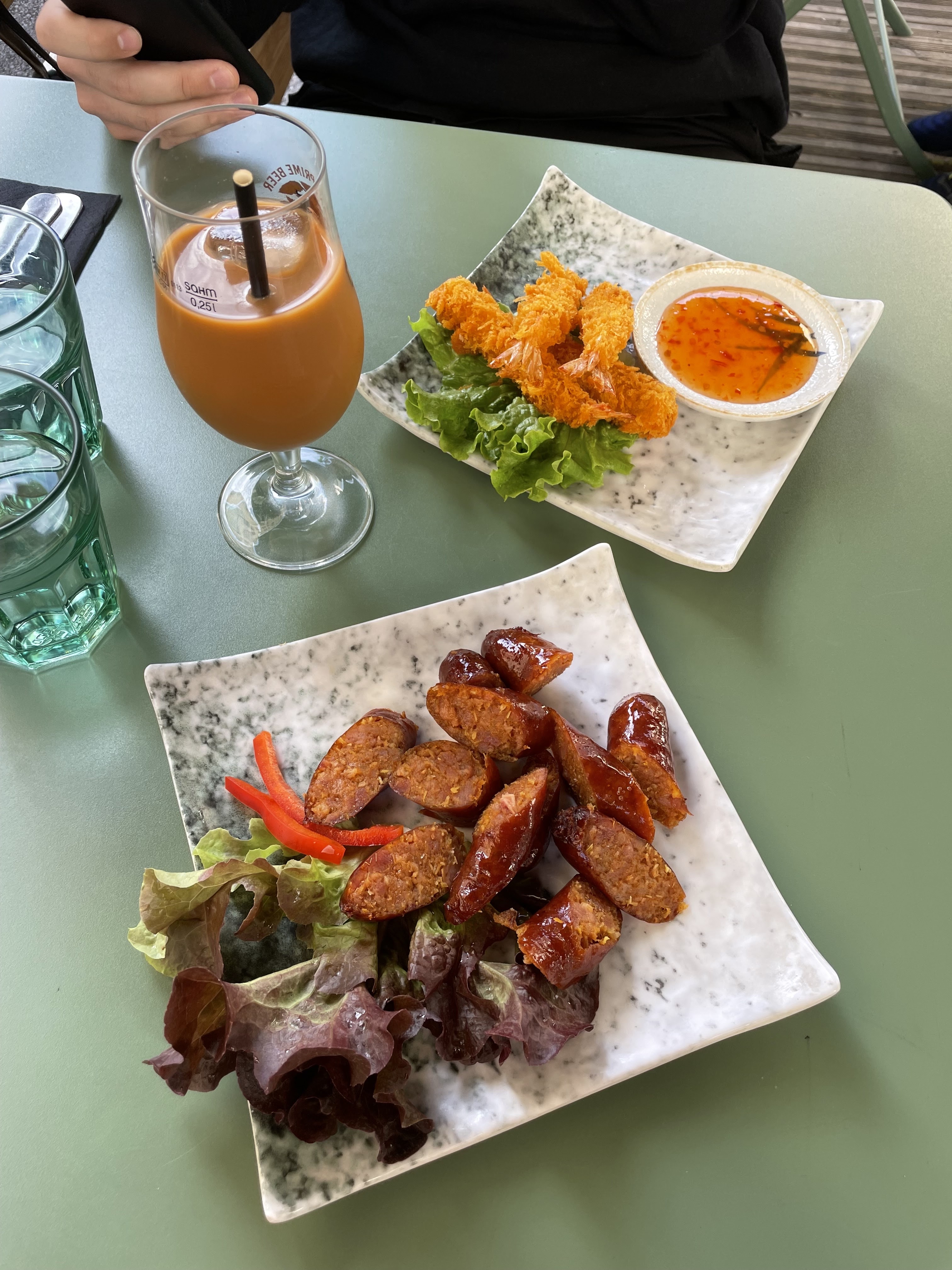 Super adresse thaï ! Nous avons commandé les beignets de crevettes et le saucisson thaï en entrée (tous les 2 à environ 6,5€), très bon avec le côté sucré-salé de la saucisse assez surprenant. En plat principal, nous avons tous les deux pris le curry massaman (12,9€), légèrement épicé et accompagné de riz et de bouillon de poulet ; un vrai délice avec le poulet parfaitement tendre et la cacahuète croustillante ! Malheureusement nous n’avions plus de place pour les desserts que nous ne manquerons pas de goûter à une prochaine occasion. Les portions sont bien copieuses. J’ai bien aimé le thé glacé thaï également, un peu trop sucré à mon goût mais bon malgré tout. Adresse à recommande !