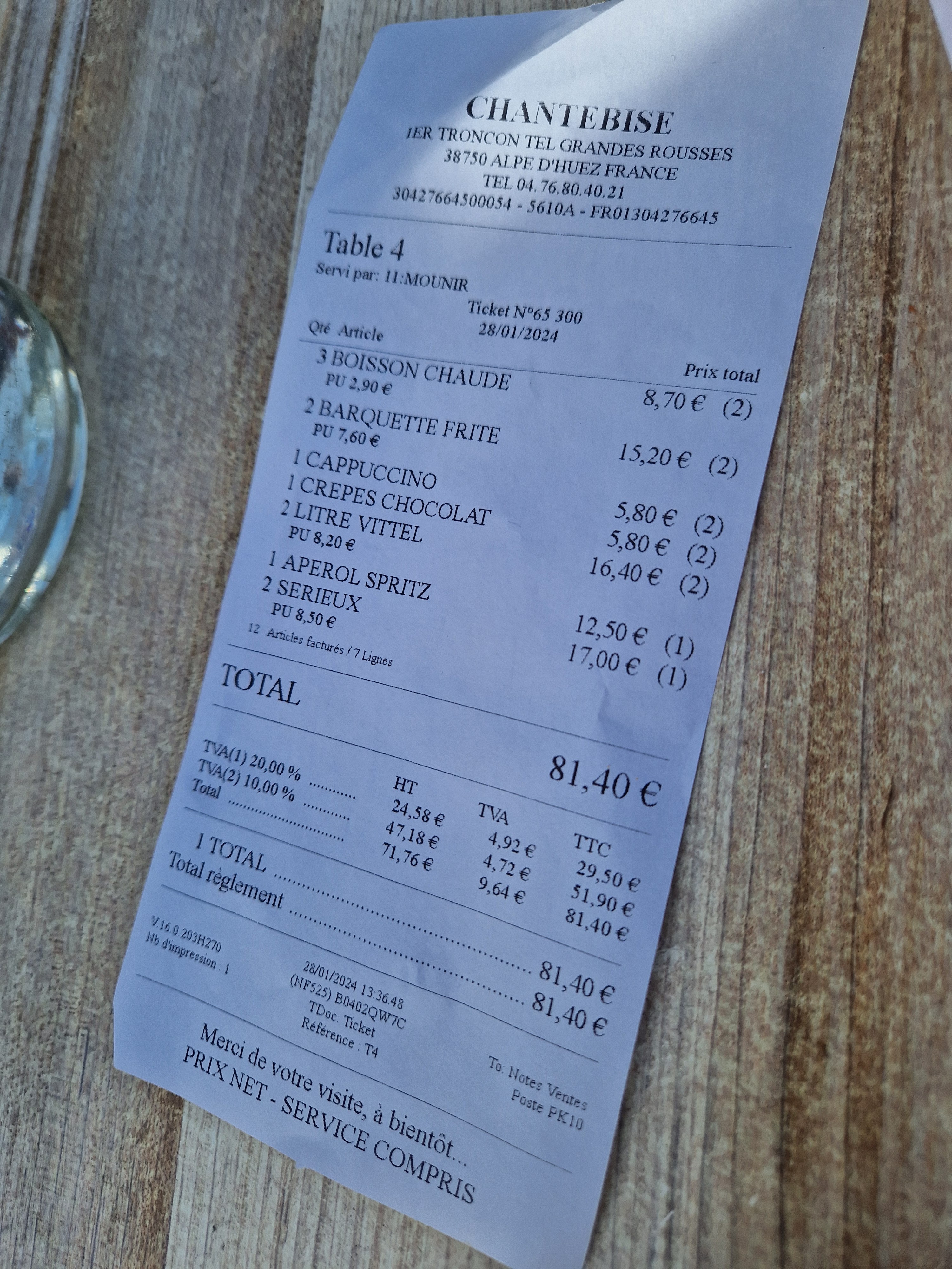 Valérie et toutes l'équipe à vos petits soins ! Panorama exceptionnel de l'Alpe d'Huez ! Prix très élevés... Par exemple 1/4 Vittel 6,20€...