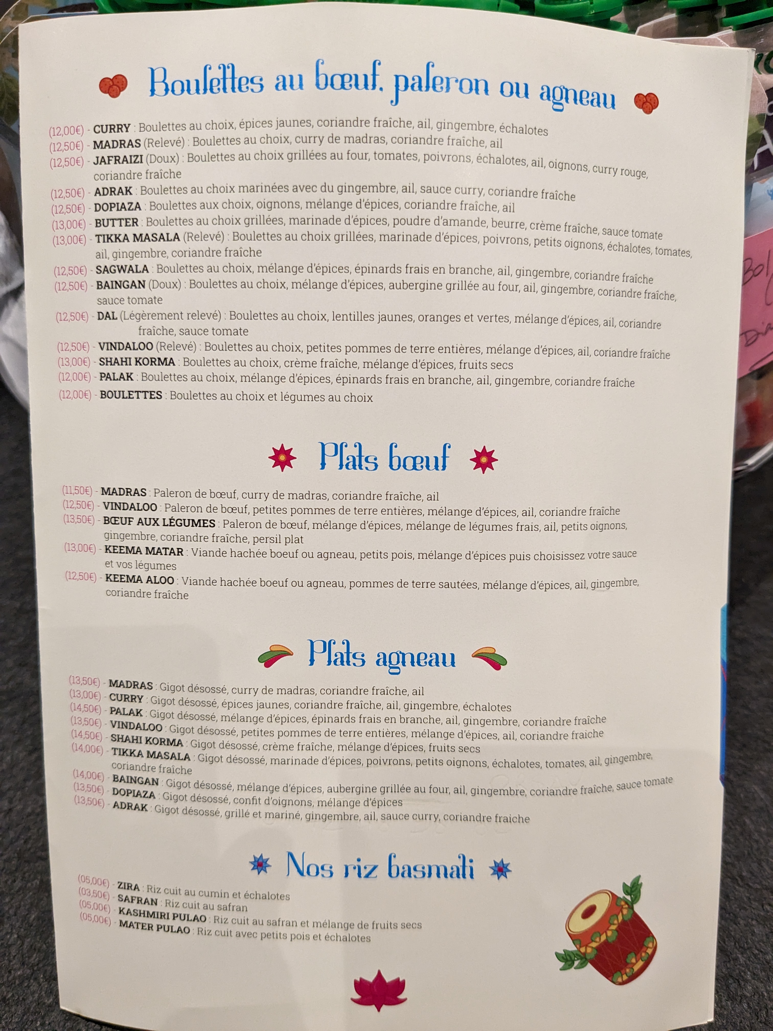 Très bonne cuisine indienne, patron sympathique. La soupe dalh est très bonne comme les nans et biryanis ainsi que le butter chicken bref on a vraiment apprécié ce repas plein de saveurs. Agréablement surpris par le dessert coloré au safran, noix de coco, etc... on n'en a pas laissé une miette. Notre famille a été charmée par ce bon repas. On reviendra vite passer un bon moment ou on passera commande à emporter.