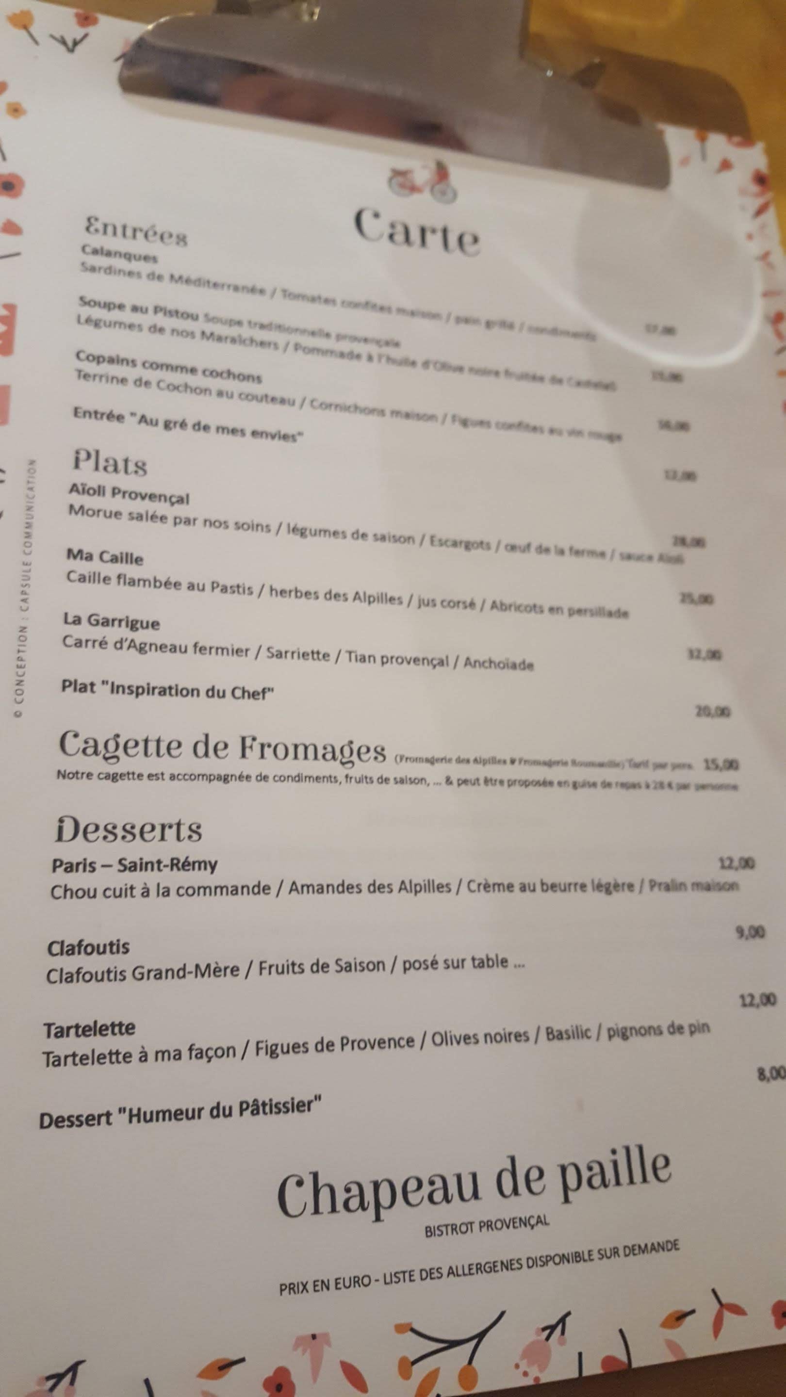 Etant en vacances à Eygalières, j'ai longtemps et un peu partout, cherché un restaurant proposant une cuisine provençale à prix raisonnable. Et je dois avouer que ce n'est vraiment pas facile dans le coin. Surtout en ce qui concerne les prix. Finalement en consultant le guide michelin je suis tombé sur Chapeau de paille et c'etait exactement ce que je recherchais. Avec ma compagne, nous avons diné en terrasse et pris l'anchoïade à partage (simple mais sympa) et en plat l'aïoli. Sur ce dernier plat, j'avoue que nous ne nous sommes pas régalé. La cuisine n'est pas en cause, c'est juste que le plat qui ne nous a pas enflammé. En revanche, les haricots verts n'etaient pas équeutés... je ne l'ai pas signalé car peut etre est ce la recette originale..quoi qu'il en soit, j'ai trouvé ça désagréable et je les ai moi meme épluchés. Pour le dessert, nous avons pris le clafoutis à la mirabelle, qui était un pur délice. Les mirabelles étaient avec les noyaux mais là, je savais que c'était normal. Le service était plaisant et efficace. La carte des boissons est plethorique et propose un large choix. On a envie de tout essayer. Enfin, il est dommage que le resto ne soit pas situé sur une jolie placette de St Rémy mais à coté d'un boulevard assez passant...mais ça les restaurateurs n'y sont pour rien... J'y reviendrai avec grand plaisir.